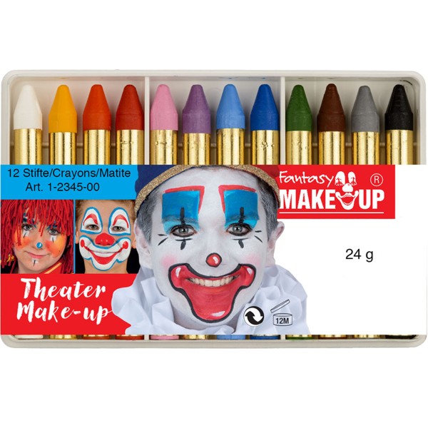 12 Schminkstifte in Schachtel, 1x weiss, 1x orange, 1x dunkel orange, 1x rot, 1x rosa, 1x violett, 1x hellblau, 1x blau, 1x grün, 1x braun, 1x grau, 1x schwarz