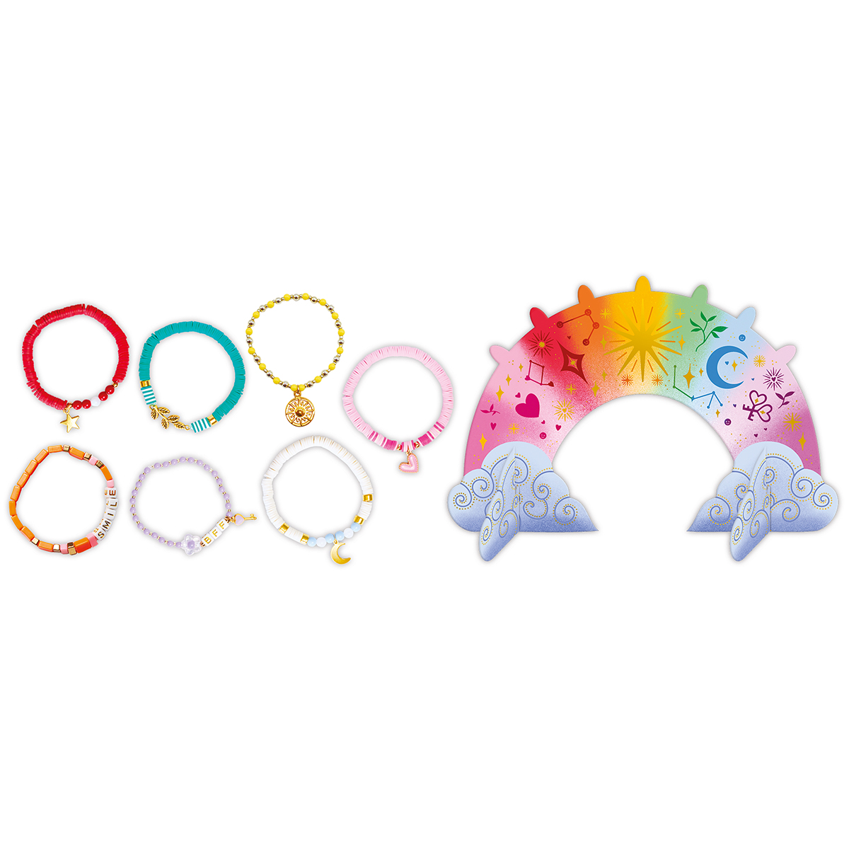 Ein Armband für jeden Tag der Woche! Mit diesem Schmuckbastelset stellen Kinder ab 7 Jahren 7 Armbänder und die dazugehörige Halterung her. Jedem Tag sein Armband: Jedes Schmuckstück ist einer Farbe und einer Energie zugeordnet. Jetzt muss man nur noch ein Armband nach der Energie auswählen, die man braucht, wenn man morgens aufsteht! Das macht dieses Kreativset zu einer tollen Aktivität, um Geduld und Geschicklichkeit zu entwickeln, aber auch zu einer guten Gelegenheit, seinen Stil durch seine Kreationen auszudrücken. Ausserdem hilft das Tragen von handgemachtem Schmuck dabei, Selbstvertrauen zu entwickeln und die eigene Persönlichkeit zu bestätigen. Diese Kreativbox enthält: 6 Charms (Stern, Mond, Herz, Sonne, Blatt, Schlüssel), 77 Rocailleperlen, 50 Acrylperlen, 4 Mondsteinperlen, 22 Metallperlen, 470 Heishi-Perlen, 22 quadratische Perlen, 8 Buchstabenperlen, 1 Blumenperle, 8 Unterlegscheiben und elastischen Faden. Ein Booklet mit Vorlagen und Anleitungen ist ebenfalls enthalten, um die Kinder bei der Aktivität anzuleiten. Was ist das Plus? Der schöne Regenbogen, mit dem man seinen fertigen Schmuck ausstellen kann, wenn er fertig ist und getragen werden kann! Dieses Hobby ist sehr einfach herzustellen und wird bei Kindern im Alter von 7 Jahren sehr beliebt sein: In diesem Alter bekennt man sich zu seinem Geschmack und liebt es, seine Outfits mit Schmuckstücken zu ergänzen, die eine symbolische Bedeutung haben! Also, was wird das Versprechen Ihres Tages sein?