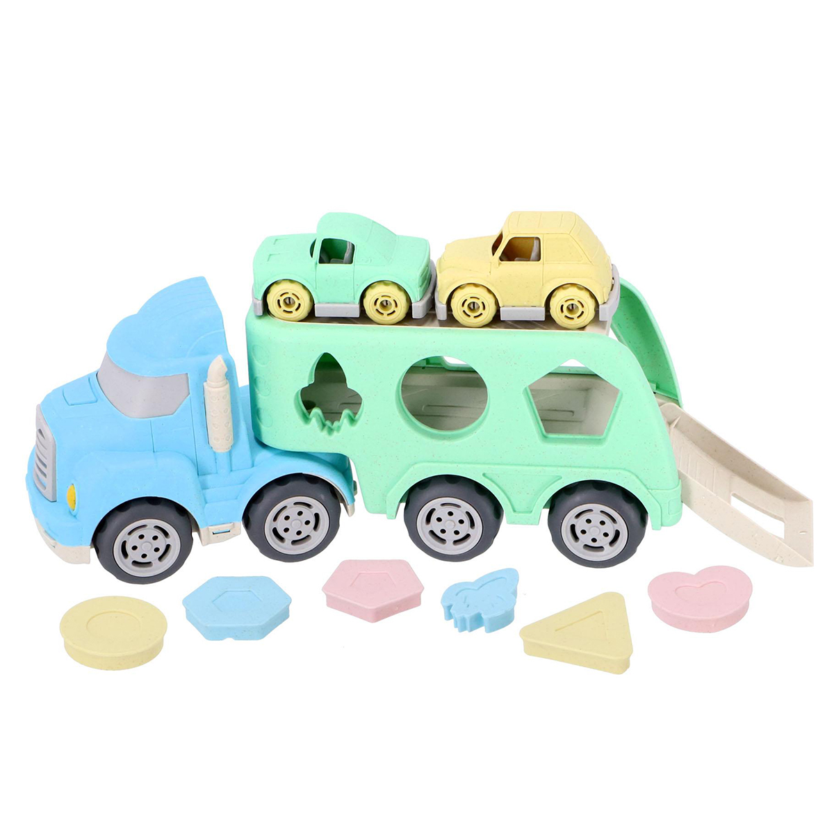 Bio Kunststoff-Transport-Lkw mit 2 kleinen Autos und seitlicher Steckformbox (6 Formen). Fördert Feinmotorik, ab 3 Jahren.