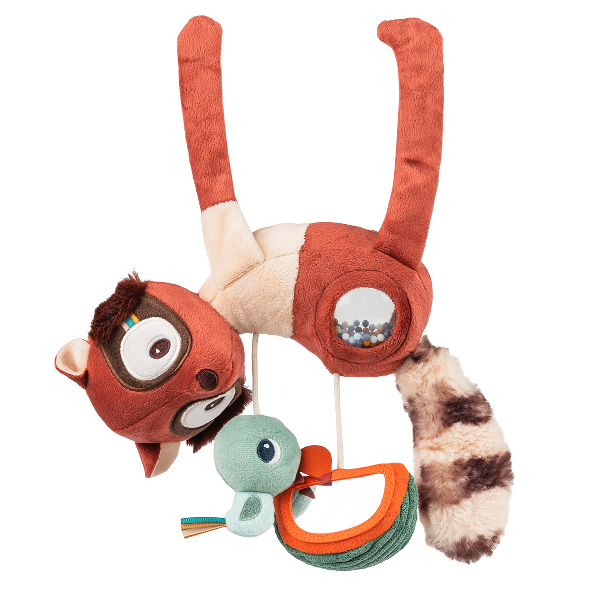 Ein lustiger kleiner Lemur begleitet das Baby auf allen Ausflügen! Mit seinen Pfoten an den Griff der Babyschale gehängt, schaukelt er fröhlich und bietet entlang seines Körpers verschiedene kleine Aktivitäten an. Geräusche, fühlbare Texturen und Formen regen die Sinne des Babys an und machen jede Fahrt noch spannender.