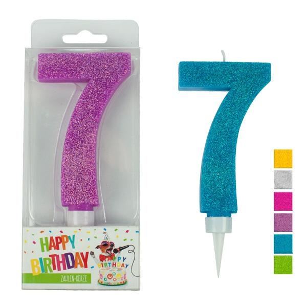 Tolle Zahlenkerze mit Glitter in den Farben grün, blau, orange, pink, lila, gelb sind der Hingucker für jede Torte. Ein muss für deine Party.