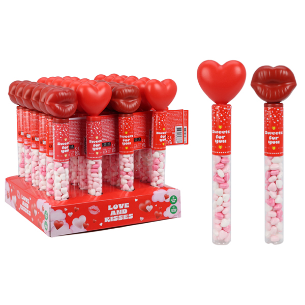 Candy Stick Love, 55g. Valentinsstick mit Dextroseherzchen. 2er Sortierung: Kussmund und Herz. Im Regaldisplay.
