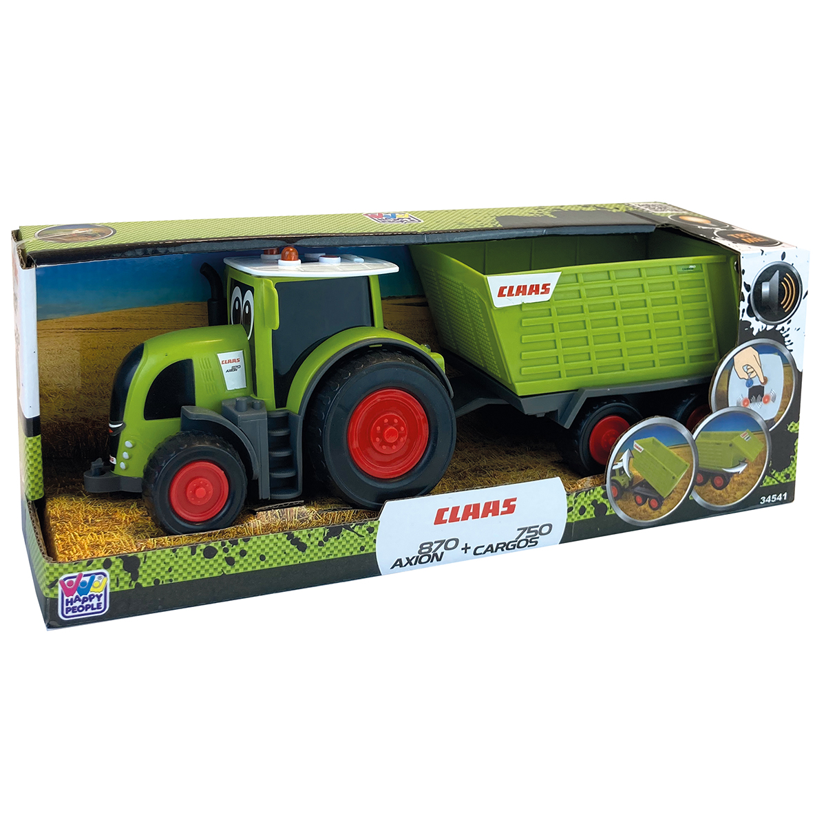 Claas Kids Axion 870 + Cargos 750, Traktor mit Anhänger 28cm, Anhängerklappte kippbar, Try me Funktion, Start-, Motorgeräusch, Licht. Inkl. Batterien.