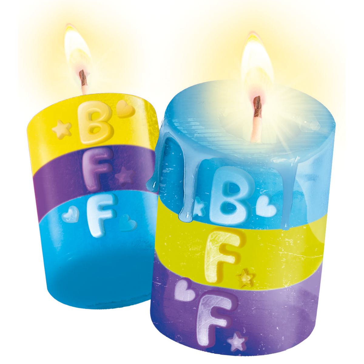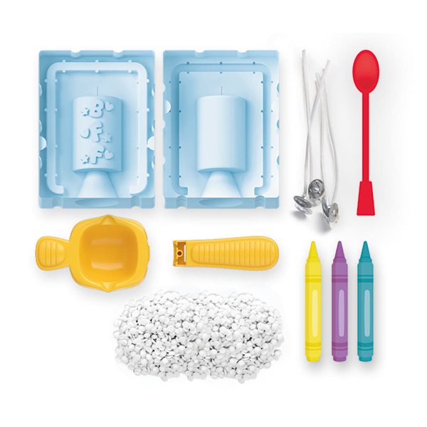 Ein kleines Set, um 2 handgemachte Kerzen mit Paraffin und Docht herzustelle. Inklusive Werkzeuge, Wachsmalstifte und Formen mit seitlichen Verschlüssen.