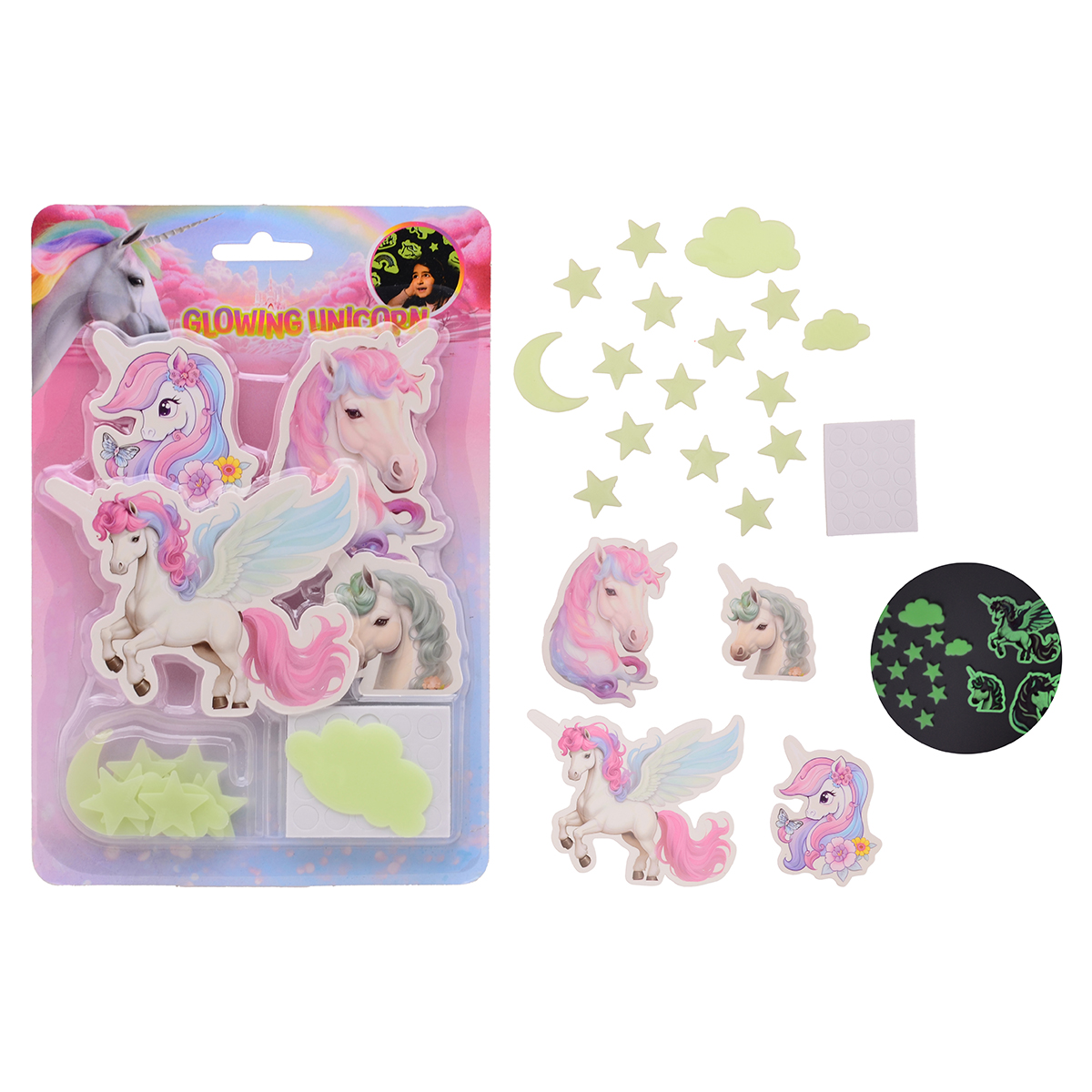 Die Einhorn Sticker laden sich im Tageslicht auf und leuchten in der Nacht.