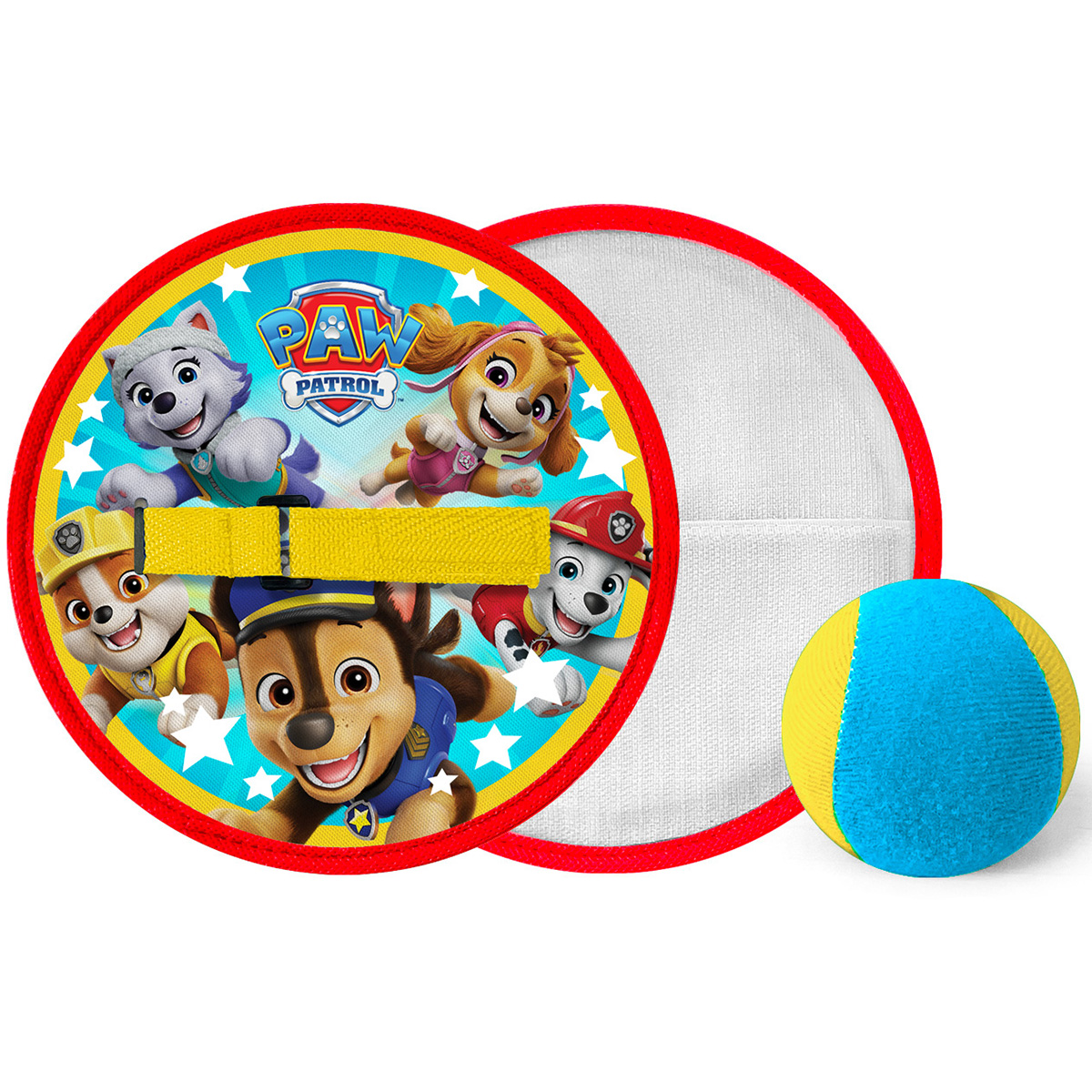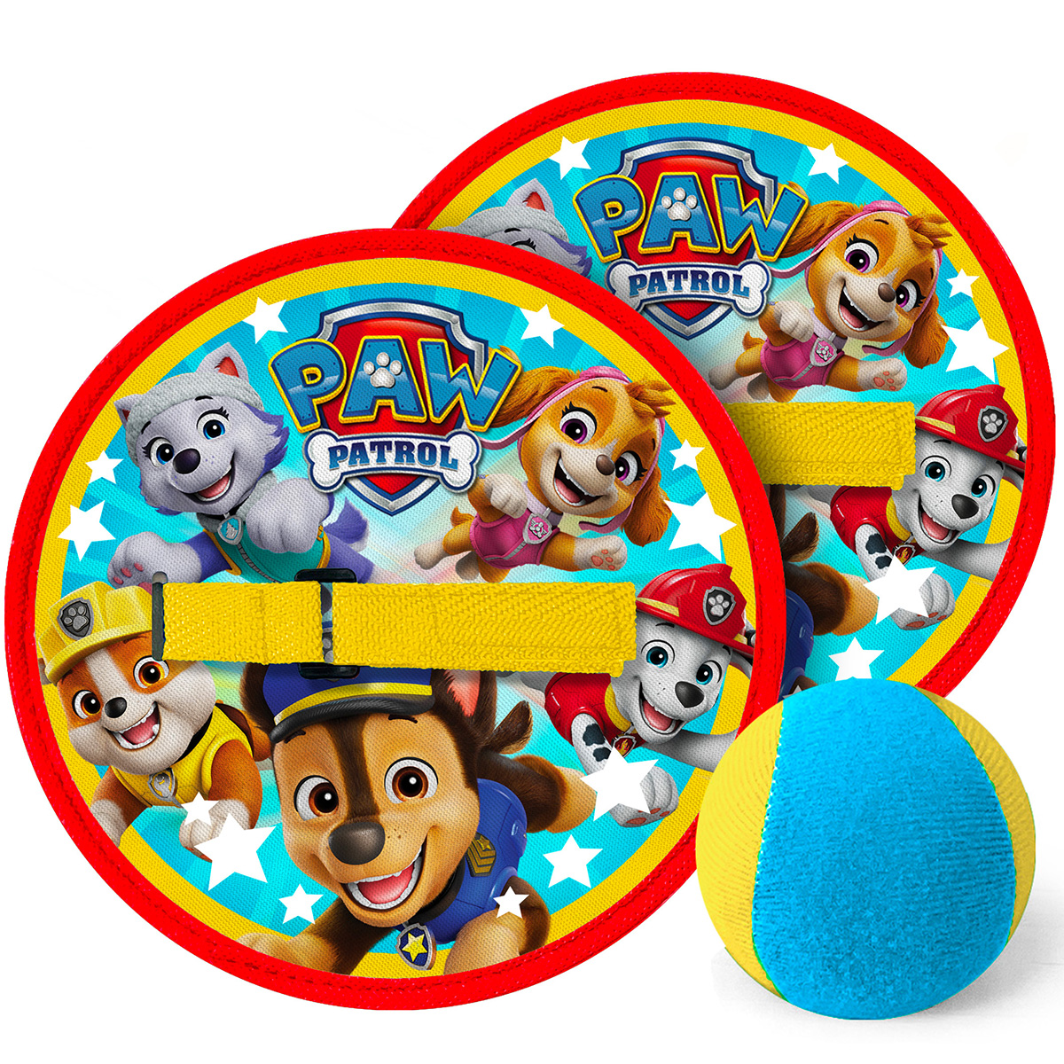 Ein lustiges Klett-Fangspiel für Kinder mit Softball und zwei Fangtellern, dekoriert mit den Paw-Patrol-Helden.
