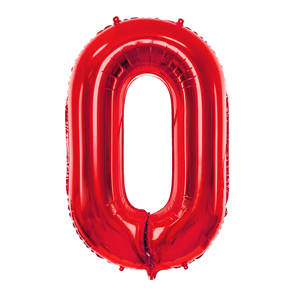 Metallisierter Folienballon, Ziffer ''0'' in Rot, Grösse vor dem Aufblasen ca. 100 cm (39''), Grösse nach dem Aufblasen ca. 86 cm (34''). Zum Aufblasen mit Luft oder Helium.