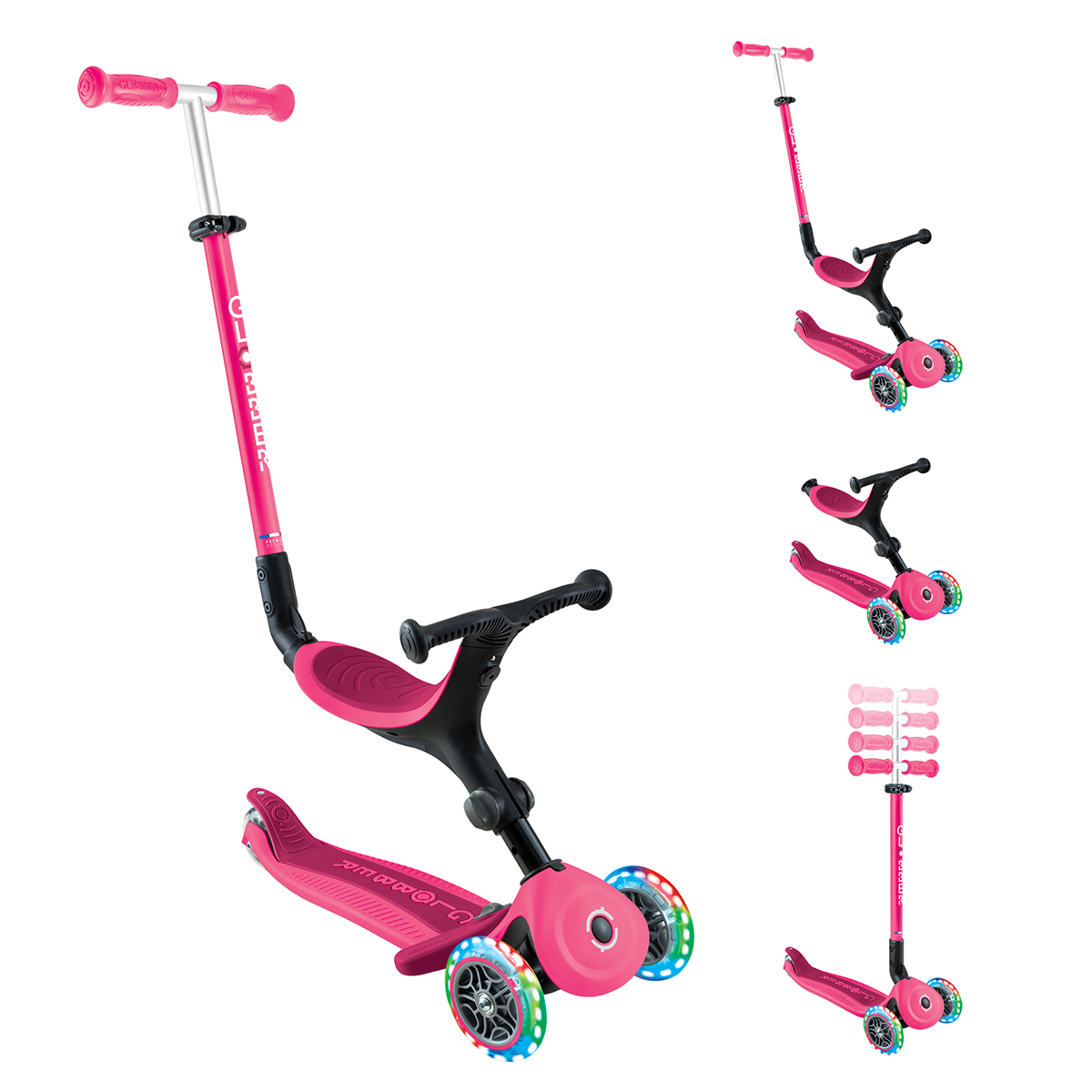 All-in-one-Produkt, das sich weiterentwickeln lässt: Tragehilfe, freistehende Draisine und faltbarer Roller. Dieser All-in-One-Roller mit abnehmbarem Sitz lässt sich ganz einfach in drei verschiedene Produkte umwandeln, während Ihr Kind lernt und wächst! Zwei 121 mm große Vorderräder (gelagert auf auf ABEC 5 Lagern) von hoher Qualität und mit hoher Elastizität blinken rot, grün und grün. blau dank des im Kern integrierten Dynamos für leuchtende Spaziergänge! Der in 2 Höhen verstellbare Sitz passt sich an, um Ihrem Kind mehr Platz zu geben, wenn es wie es wächst. Der in 4 Stufen verstellbare T-Bar-Lenker. Positionen ist mit einer stabilen Klemme ausgestattet. und TPR-Griffen für maximalen Komfort ausgestattet.
