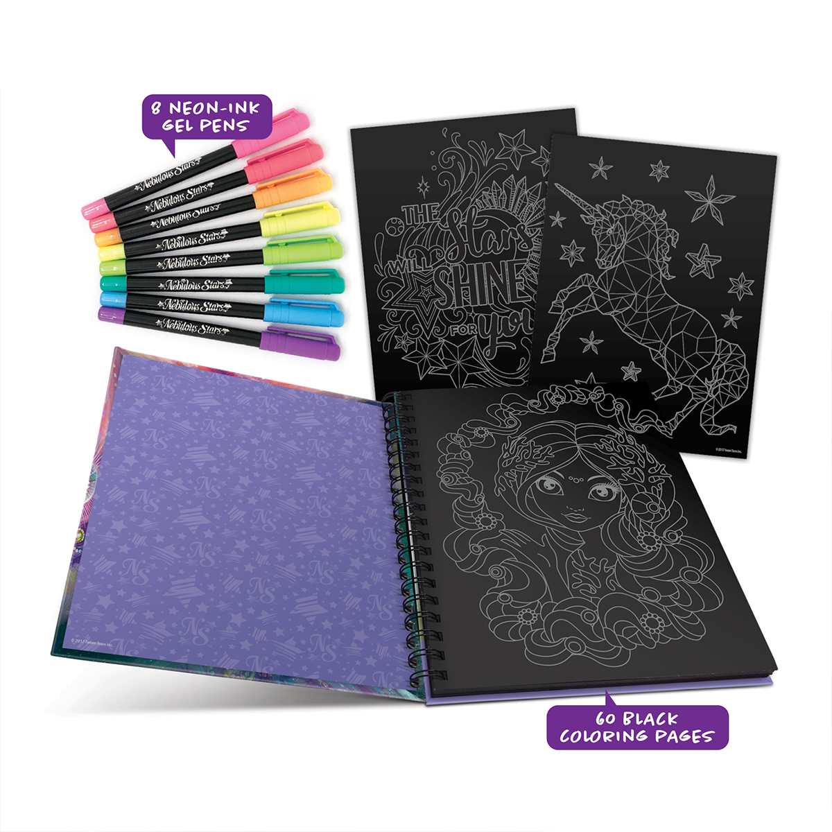 60 schwarze Malvorlagen. 8 Neon-Tintengelschreiber. Die ganze Geschichte von Coralia Hazelia.