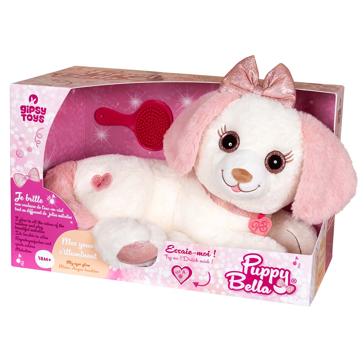 Puppy Bella - ein weicher und schöner Hund, der in den Farben des Regenbogens leuchtet, schöne Geräusche macht und seine Augen leuchten! Dieser Hund hat auch einen stummen Modus.