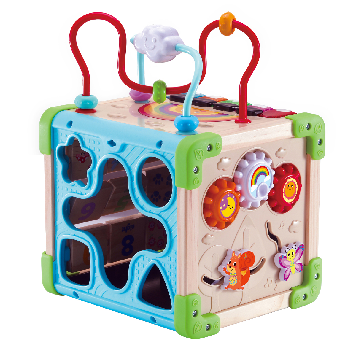 Nachhaltig produzierter Lernwürfel für kunterbunten Spielspaß. Liebevoll gestalteter Holzwürfel mit individuellen Würfelseiten und verschiedenen Elementen. 3 Spielmodi: Musik, Lernen, Entdecken. 5 Klaviertasten für Farben, Formen und Musik. Auf dem Würfel befinden sich bunte Holzperlen, die man über den Abakus schieben kann. Berührt das Kind die Tiere, stellen sie sich vor und verraten, welche Instrumente sie spielen.Lerninhalte: Formen, Farben, Zahlen, Zählen. Abnehmbares Telefon: Als Rassel benutzen oder Tierfreunde anrufen. Zahlenblöcke drehen, um bunte Tiere oder Objekte zu entdecken und zu zählen. Das Drehen der Zahnräder und das Verschieben der Tiere schult die Feinmotorik. 1 gesungenes Lied und zahlreiche kurze Melodien. Kindersicheres Batteriefach, Abschaltautomatik und Lautstärkeregler