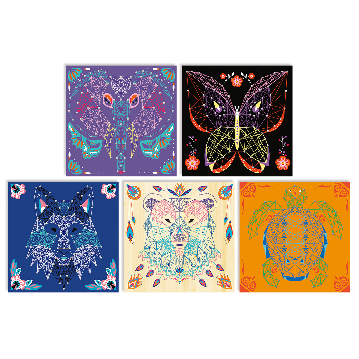 5 Fadenbilder zum Selberspannen mit 10 verschiedenen Baumwollfäden von je 7 Metern, 800 Nägeln und 1 Werkzeug für das Setzen der Nägel. Inklusive 1 Heft mit Vorlagen und Anweisungen.