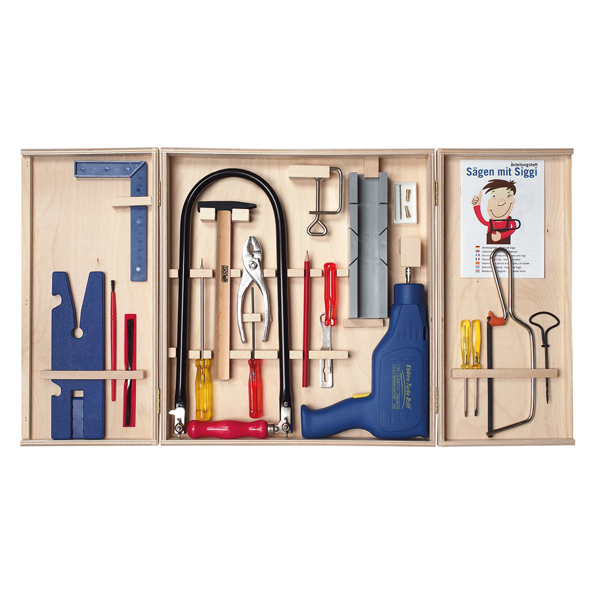Das umfangreiche Zubehör mit Stahlwerkzeugen ist sicher im Holzschrank mit Flügeltüren verstaut und wird bei diesem Set durch die elektrische Bohrmaschine ergänzt: der kleine Bastler kann Löcher ganz leicht elektrisch selber bohren. Tolles Werkzeug für Kinder! Inhalt: Laubsäge, Holzbrettchen mit Einspannhalterung, Zwinge, Laubsägeblätter, Laubsägeschlüssel, Vorlage, Stahlhammer, Stahlzange, Säge, Schneidelade, Rundfeile, Ahle, grosser Schraubendreher (Schlitz), kleiner Schraubendreher (Schlitz), Schraubendreher (Kreuz), Ringbohrer, Bleistift, Pinsel, Winkel, batteriebetriebener Elektro Turbo Drill (Bohrmaschine mit Bohrer), Anleitung, 34x37cm, aus hellem Pappel-Holz, 21 Teile, 4 x C Batterien nicht enthalten