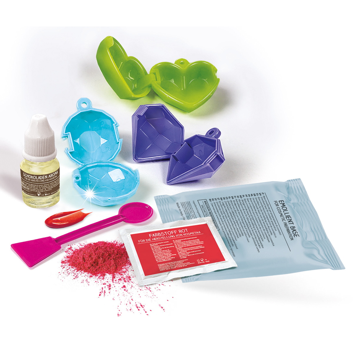 Lippen-Balsam. Ein wissenschaftliches Set, um die Geheimnisse der Kosmetik zu entdecken und einen fantastischen Lippenbalsam herzustellen. Ausserdem sind farbige Formen in verschiedenen Grössen enthalten, mit denen du eine ganz besondere Kosmetikkreation herstellen kannst. Geprüfte und sichere Bestandteile.