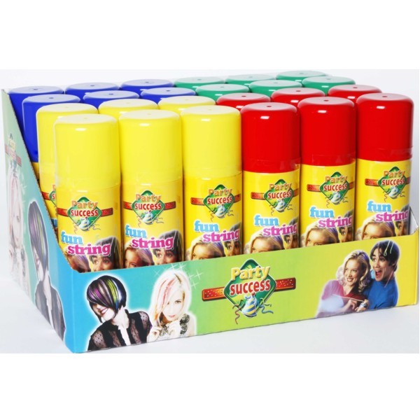 Luftschlangenspray 70ml im Display 24 Stück in den Farben: gelb, grün, blau, rot.