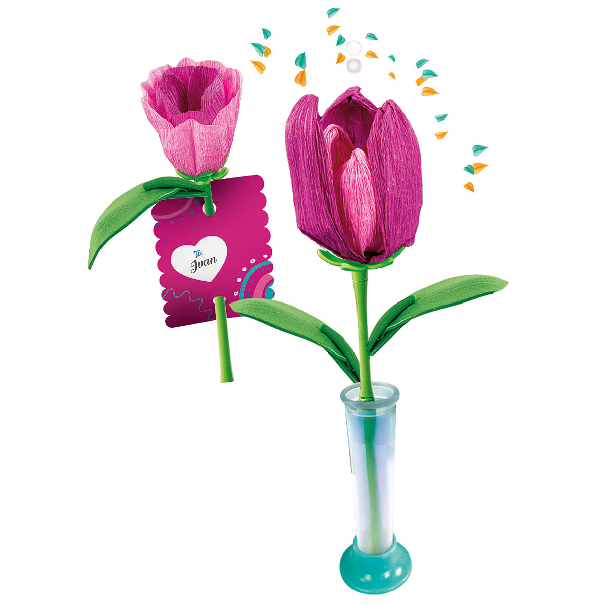 Eine originelle Kreation um 2 Tulpen zusammenzustellen und sie mit verschiedenen Farben zu personalisieren. Ein praktisches und reichhaltig sortiertes Set mit Stielen, Blütenblättern zum Färben, Blumenkronen zum Zusammenstellen und dem Blumenhalter zum Zusammensetzen und Dekorieren. Ab 7 Jahren.