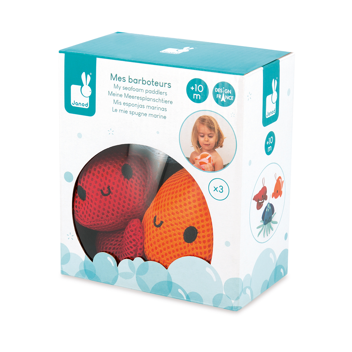 Begleiten Sie Ihr Kind mit diesen hübschen Badeschwämmen auf dem Weg zur Selbständigkeit! Dieses Sortiment besteht aus 3 Meerestieren: Hummer, Clownfisch und Tintenfisch. Machen Sie die Schwämme einfach nass und geben Sie etwas Seife hinzu, um sie aufzuschäumen. Mit den bestens an Kinderhände angepassten Badeschwämmen lernt Ihr Kind spielerisch, sich allein zu waschen. Badespielzeug für Kinder ab 10 Monaten.