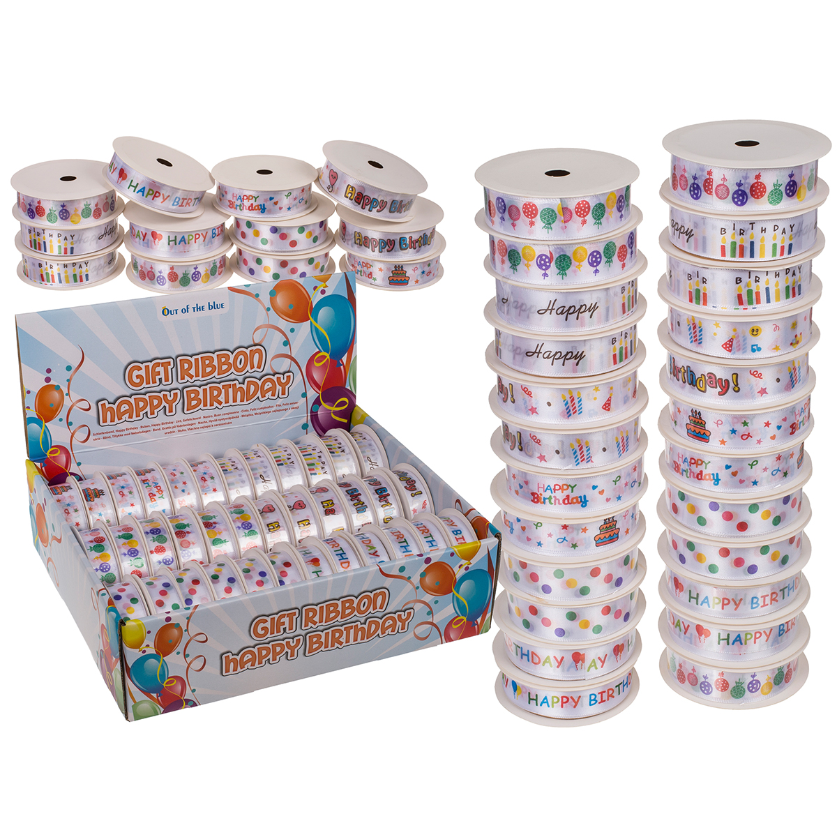Schleifenband Happy Birthday 6-fach sortiert, 2 cm x 2 m 100% Polyester