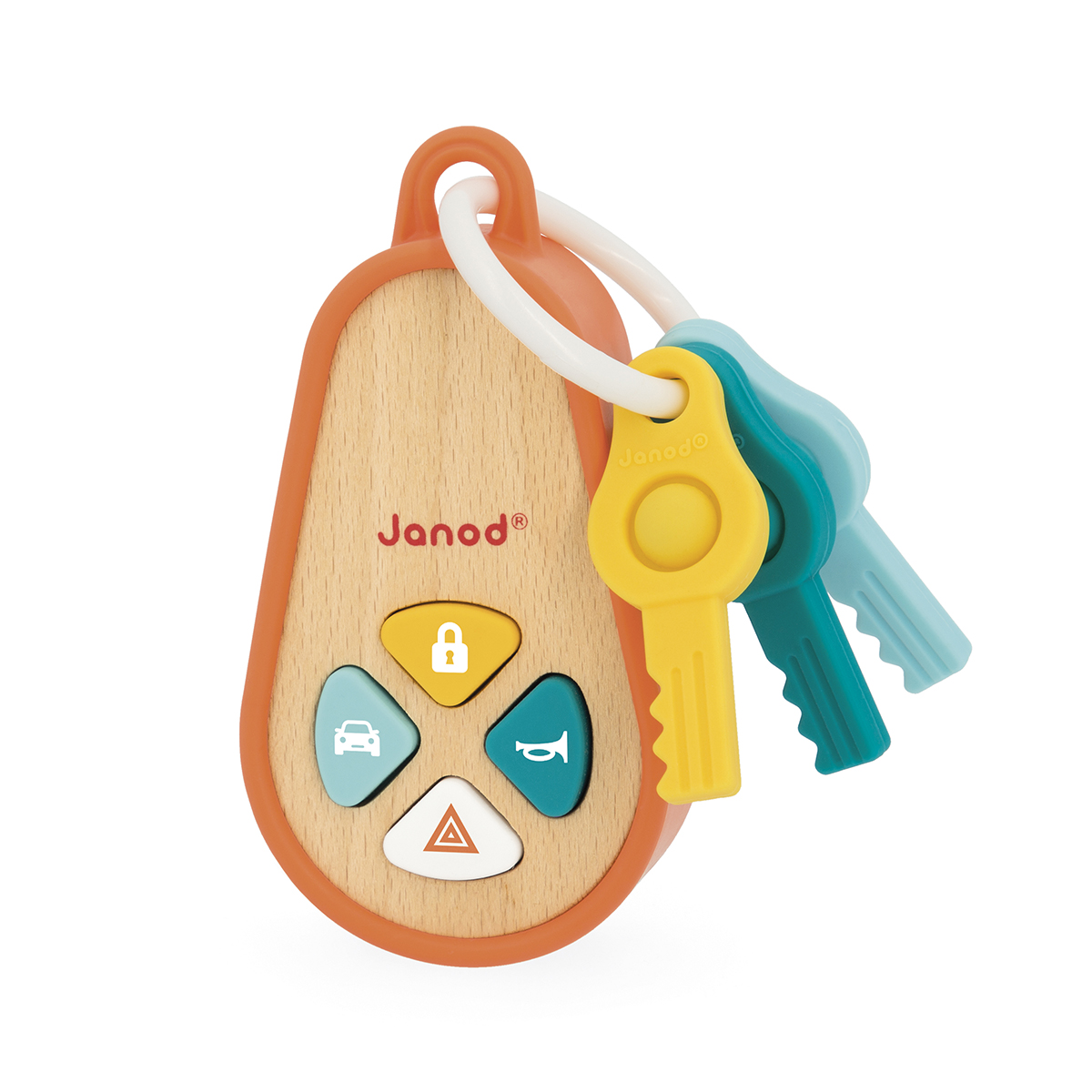 Alle Kleinen träumen von ihrem eigenen Schlüsselanhänger! Dieser hier ist genau für sie gemacht. Dank der Silikonhülle liegt er gut in der Hand und begeistert mit 4 Knöpfen und realistischen Geräuschen: Öffnen, Hupen, Warnblinker und Motorstart. Die 3 Silikonschlüssel mit Pop-it-Funktion fördern die Feinmotorik, die sensorische Entwicklung und die Hand-Auge-Koordination. FSC Holzspielzeug zur Frühförderung, ab 18 Monaten geeignet. Funktioniert mit 3 Batterien (LR44-1,5V), inbegriffen.
