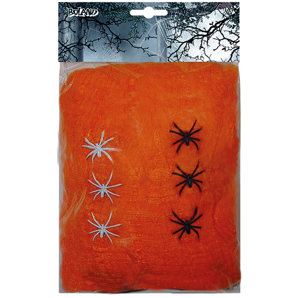 Spinngewebe mit Spinnen orange inkl. 6 Spinnen in grau und schwarz als Dekoration für Halloween. Grösse: 4x5cm, Gewicht: 100g