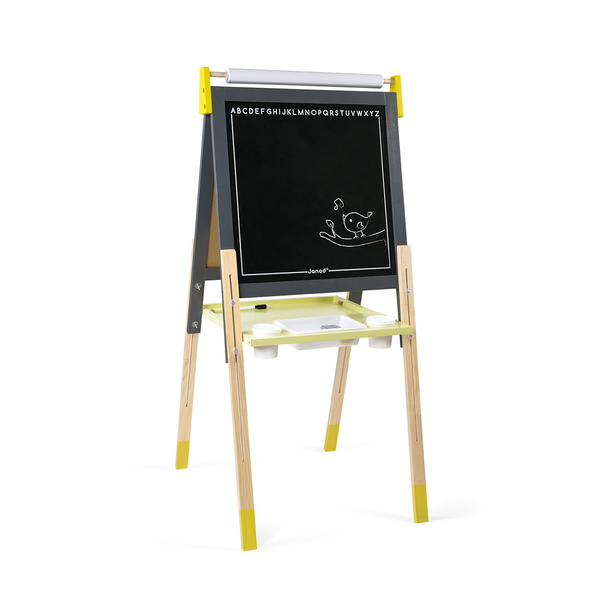 Standtafel 58x65x126cm, magnetisch, zusammenklappbar, höhenverstellbar. Holzspielzeug für Kinder von 3 bis 8 Jahren. Eine weisse magnetische Tafel für abwischbare Filzmarker und eine Tafel zum Beschreiben mit Kreide. Umfangreiches Zubehör: 6 Magnete, 10 Kreiden, 1 abwischbarer Filzmarker (trocken), 1 Papierrolle und 1 Bürste für die Tafel. Die Höhe ist von 91 bis 126 einstellbar. Sehr praktisch: Tafel ist zusammenklappbar und kann ganz einfach weggeräumt werden.