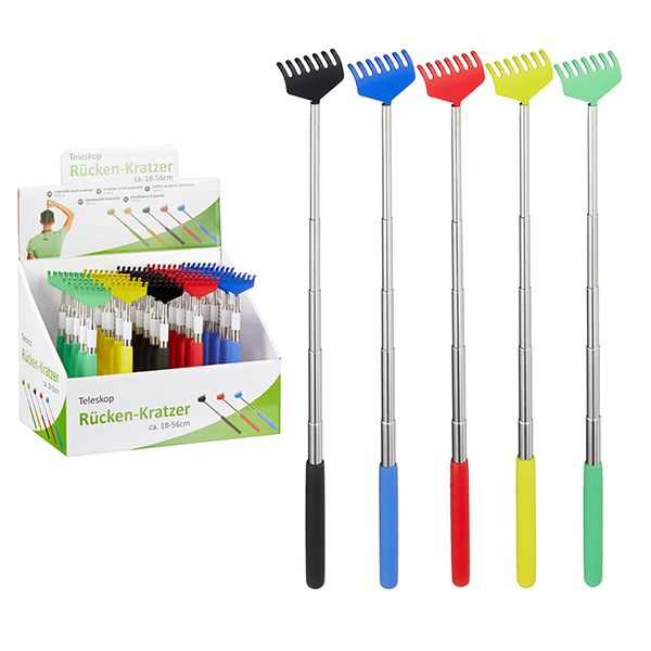 Teleskop Rückenkratzer 56cm in display assortiert in 5 verschiedenen Farben (rot, blau, grün, schwarz, gelb), 25pcs.