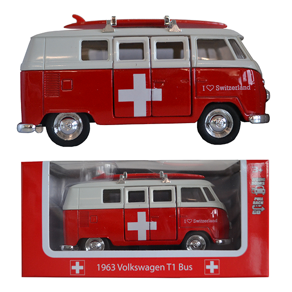 1:38 VW Bus T1 mit Surfboard 12cm, mit Rückzugfunktion, aus Spritzguss, in Sichtbox.