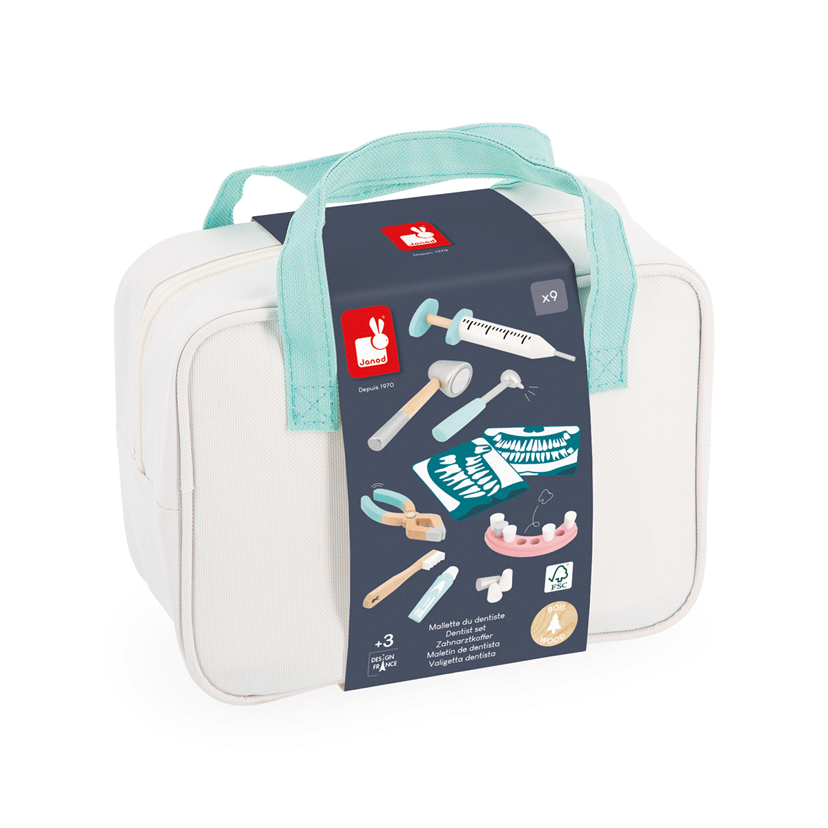 Dein Zahn hat ein Loch! Wir werden dieses Problem bald beheben! Bzzzzzz! Dieses attraktive 9-teilige Set besteht aus Spritze, Pinzette, Zahnbürste, Zahnpasta, Zahnspiegel, Zahnersatz mit acht herausnehmbaren Zähnen, Zahnbohrer und zwei Karten mit Röntgenbildern des Kiefers. Dies ist perfekt für jeden angehenden Zahnarzt! Dieses grossartige Spiel ist eine unterhaltsame Möglichkeit, Ihrem Kind beizubringen, auf seine Zähne zu achten! Wasserfarbe. Aus FSCTM-zertifiziertem Holz. Imaginäres Spielzeug für Kinder ab 3 Jahren.