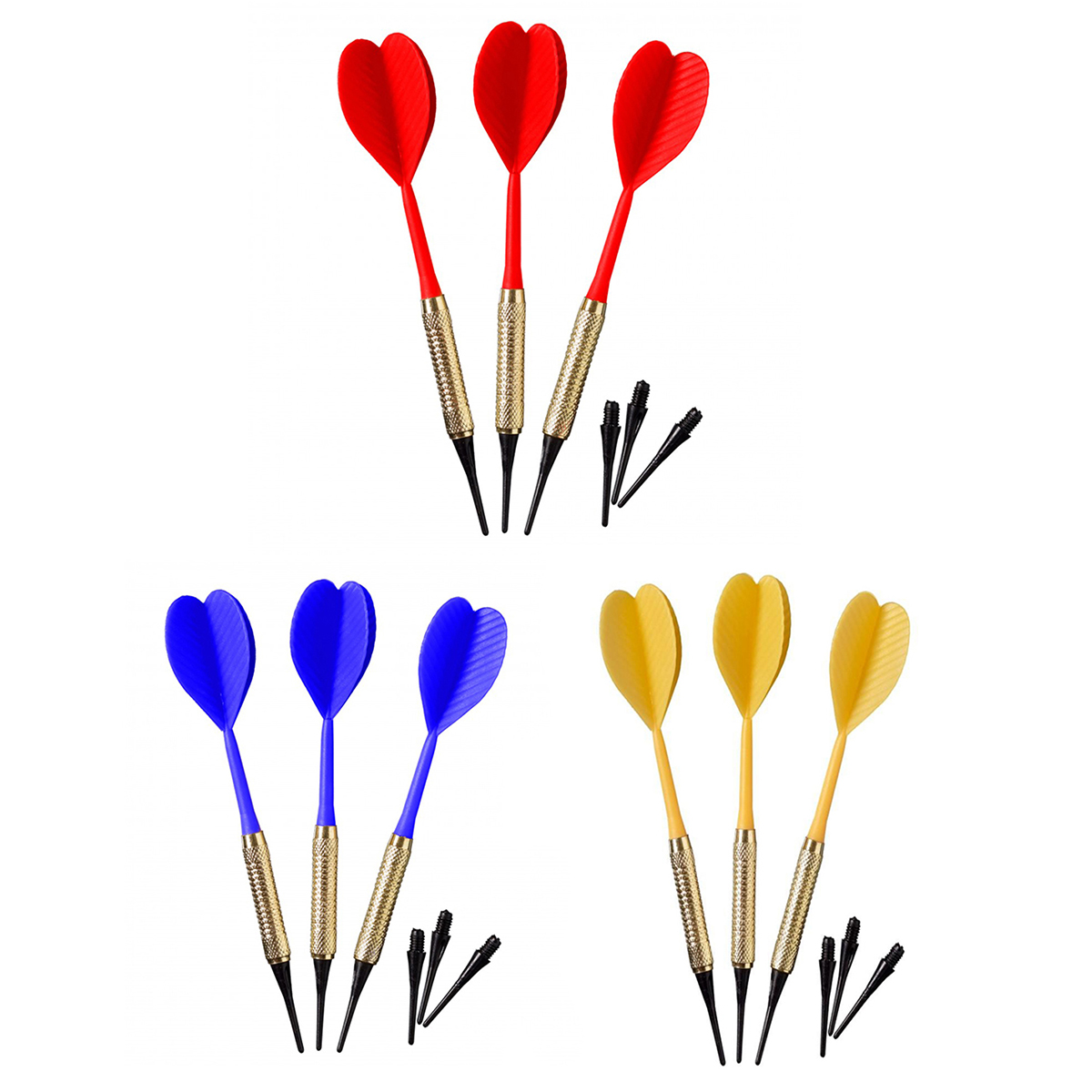 Fléchettes Safety Standard en laiton avec pointe en plastique noir. Couleur: rouge, jaune et bleu assortis. Incl. trois pointes de rechange. Poids: 7 grammes.