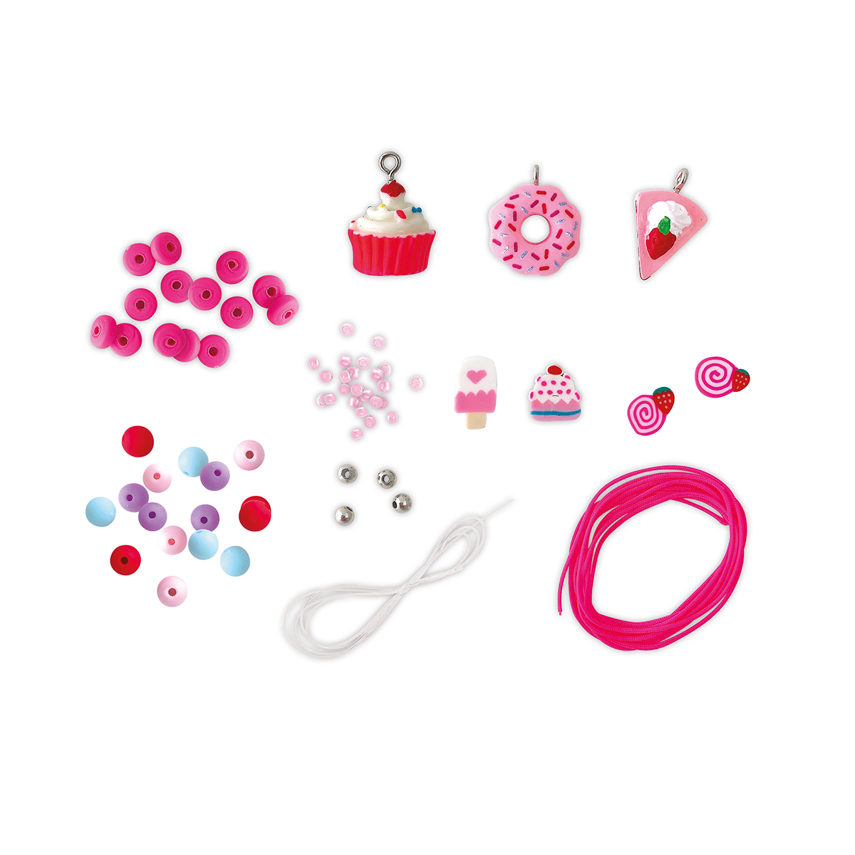 Les gourmands en auront l'eau à la bouche ! Ce coffret créatif permet de réaliser 1 collier, 2 bracelets et 2 bagues en perles et breloques en forme de pâtisserie, bonbons ou autre gourmandise. Il contient 3 breloques gourmandises (un mini donut, une part de fraisier, un cupcake), 3 perles gourmandises (une glace, un cupcake, un gâteau à la fraise), 35 perles rondes, 15 grosses perles heishis, 60 perles de rocaille, 35 perles argentées, du fil élastique, du fil rose et 1 livret avec les instructions et les modèles. Cette activité permet de développer sa patience et sa dextérité. Elle est idéale pour les enfants à partir de 6 ans.