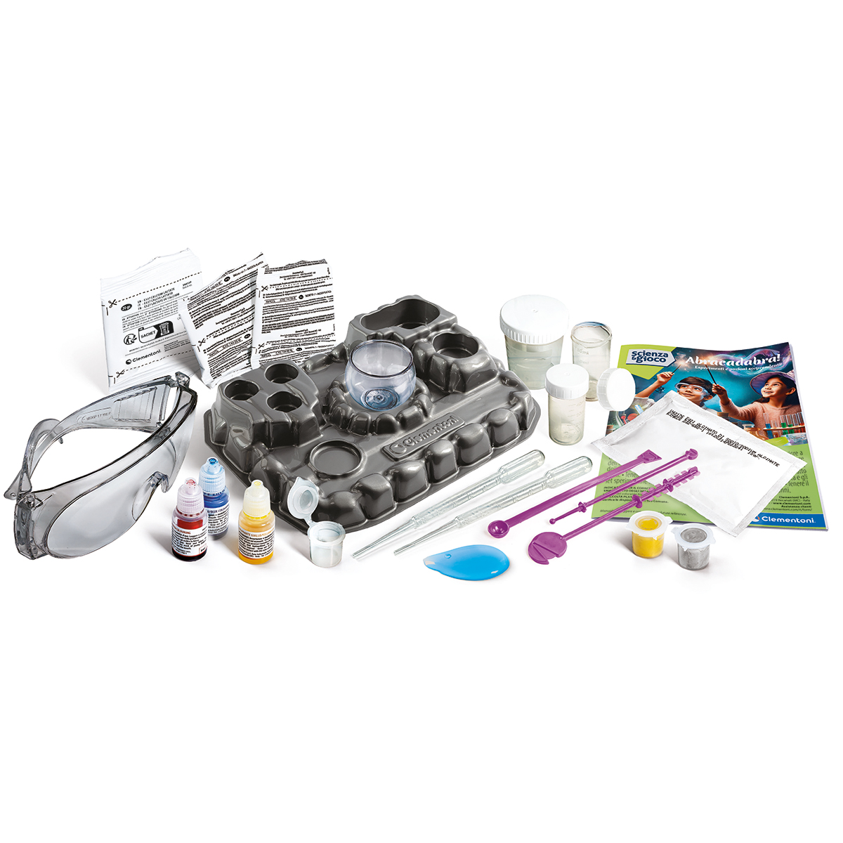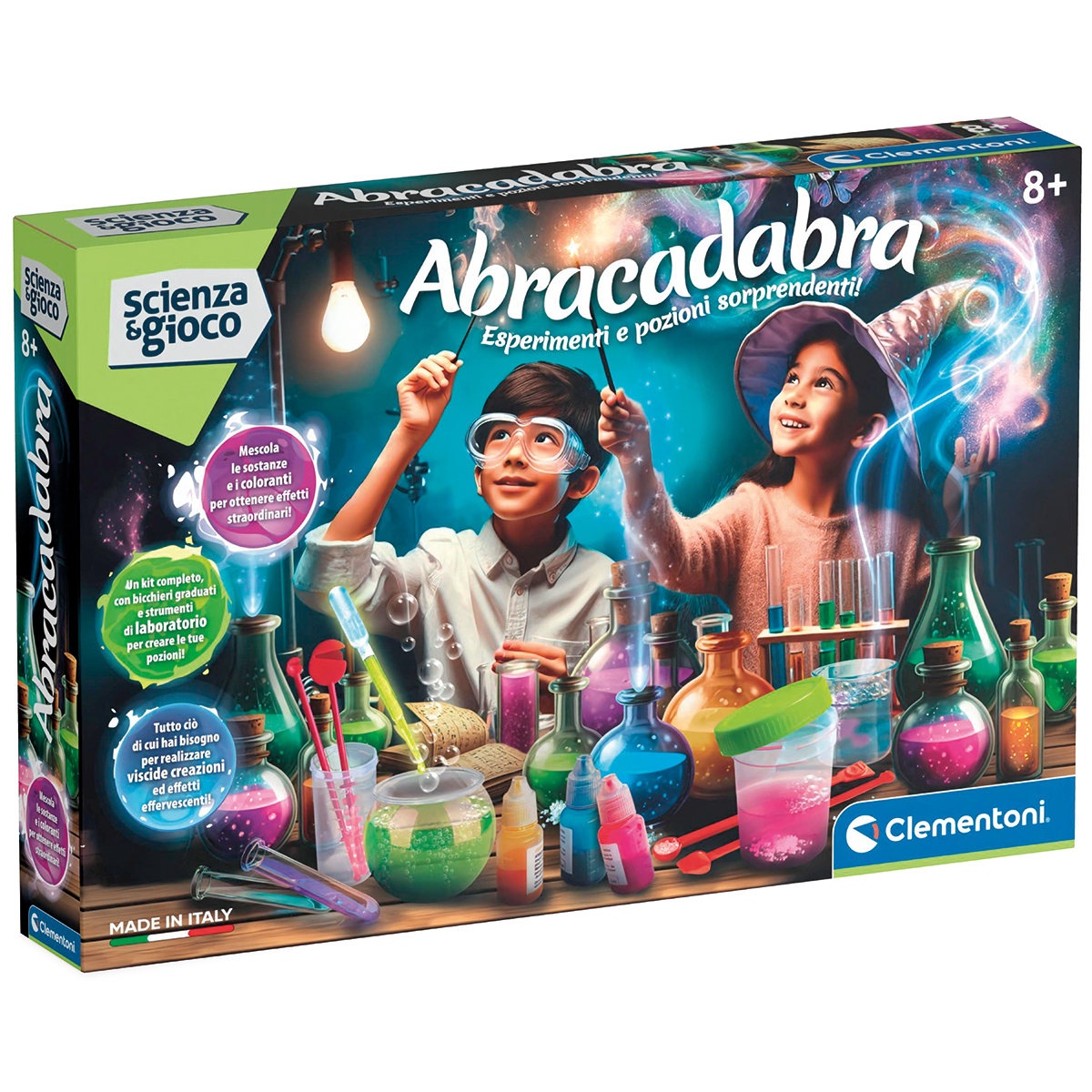 Abracadabra - Esperimenti e pozioni sorprendenti. Un gioco per diventare un vero alchimista e scoprire il magico mondo delle pozioni!. Tanti strumenti di laboratorio e sostanze chimiche per realizzare esperimenti sorprendenti. Il kit include un mini calderone in cui mescolare sostanze magiche e misteriose, come il sangue di unicorno, il veleno di serpente e l’estratto di rana.