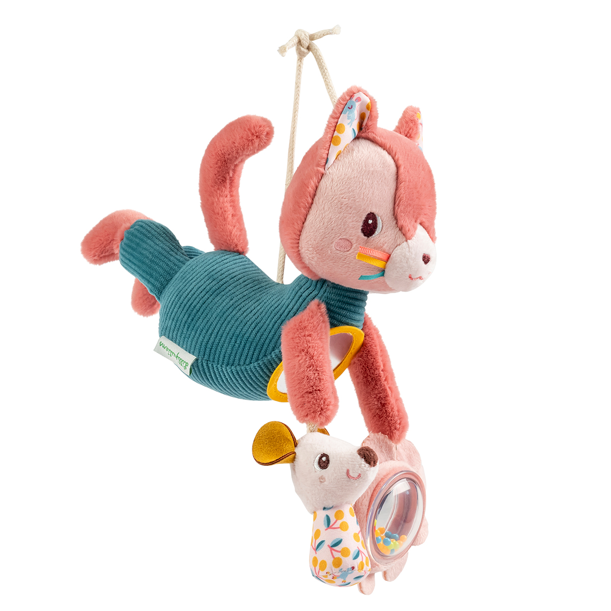 Jeanne s'occupe du bébé et le divertit ! Ce chat en peluche suspendu est idéal pour occuper votre enfant dans la voiture, la poussette, etc. Vous pouvez même accrocher Jeanne à l'arche d'éveil pour lui offrir un moment de jeu confortable ! Ce jouet portable convient aux enfants à partir de 3 mois et a quelque chose de fascinant pour votre bébé. Grâce au miroir rond sur le ventre de Jeanne, il peut se reconnaître et s'observer, et s'amuser à attraper les petits jouets éducatifs qu'elle lui tend gentiment : son petit ami, la souris, contient du papier bruissant qu'il ne se lasse pas de froisser et la jolie fleur a une boule qui fait du bruit, amusante à secouer, mais aussi à regarder avec ses belles couleurs ! Trois activités pour un jouet suspendu complet et super amusant ! Avec cet adorable chat en peluche, votre bébé peut jouer avec les sons, les textures et les reflets. En compagnie de notre petit chat de jardin, ses sens sont stimulés. Ce jouet d'éveil est facile à suspendre et à retirer grâce à sa ficelle. Il peut donc également être utilisé comme doudou. Un véritable indispensable pour les sorties avec votre bébé : lorsque la poussette ou la voiture bouge, la peluche rose se balance d'avant en arrière et prend vie. Cela permet de maintenir l'intérêt de votre enfant. Jeanne est une petite chatte pleine d'énergie : elle porte une combinaison à structure côtelée, agréable au toucher, mais aussi très pratique lorsqu'elle joue dehors. Les motifs cerises imprimés sur ses oreilles rappellent les fruits qui poussent dans son jardin. Et ses petites moustaches ! Avec leurs différentes couleurs, elles sont très amusantes ! Grâce à sa taille pratique, vous pouvez offrir ce jouet pour tout-petits comme cadeau de naissance, toujours prêt pour une promenade au grand air.