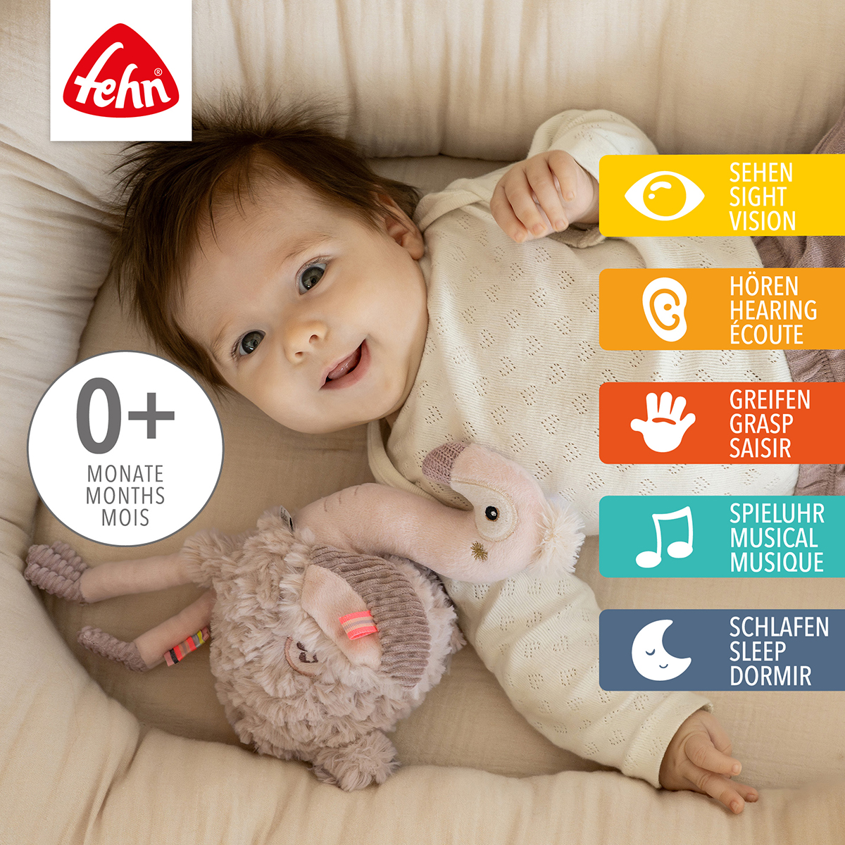 Le flamant rose doux et câlin de la collection Lazy, Crazy & Pink est l’aide au sommeil idéale, un protecteur et un ami câlin la nuit. Le jouet câlin avec module sonore et capteur Cry intégré calme les bébés, crée un environnement familier et assure la sécurité. Le module de sons joue cinq sons de la nature différents ainsi que cinq mélodies de boîte à musique. Le capteur Cry intégré dans le module sonore reste en mode veille pendant 2 heures et réagit aux sons (par exemple, les pleurs de bébé). Immédiatement, l’aide au sommeil émet à nouveau les sons ou les bruits agréables, calme et assure un sommeil réparateur à bébé avec de grands rêves.