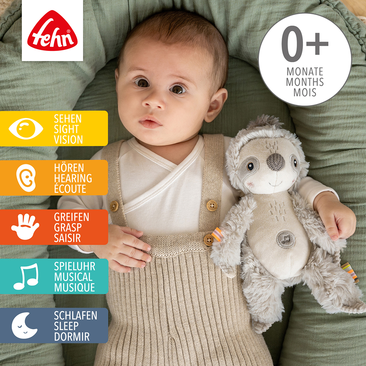 Le doux paresseux de la collection Lazy, Crazy & Pink est l’aide au sommeil idéale, un protecteur et un ami câlin la nuit. Le jouet câlin avec module sonore et capteur Cry intégré calme les bébés, crée un environnement familier et assure la sécurité. Le module de sons joue cinq sons de la nature différents ainsi que cinq mélodies de boîte à musique. Le capteur Cry intégré dans le module sonore reste en mode veille pendant 2 heures et réagit aux sons (par exemple, les pleurs de bébé). Immédiatement, l’aide au sommeil émet à nouveau les sons ou les bruits agréables, calme et assure un sommeil réparateur à bébé avec de grands rêves.