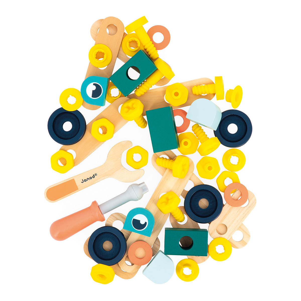 Robots, véhicules et créatures en tout genre, prennent forme grâce à ce set de bricolage ! Il se compose de 50 pièces : 10 plaquettes, 4 roues, 4 rondelles, 2 yeux, 5 blocs en bois, 5 boulons, 8 inserts, 10 vis, 1 tournevis et 1 clé. Afin de se familiariser avec les différents assemblages, et guider votre enfant pour ses premières constructions, 10 cartes modèles sont incluses. Pratique, ce joli baril peut être emmené partout grâce à sa ficelle en coton ! Petit plus, les vis sont équipées de cran pour ajouter un peu plus de jouabilité et de difficulté. Jouet en bois et carton FSCTM. Jouet d’imitation pour les enfants à partir de 3 ans. Lors de la création de notre gamme Brico’Kids, nous avons fait le choix d’imaginer une nouvelle visserie, unique, qui apporte une signature forte aux produits tout en améliorant grandement la fonctionnalité des outils. Robots et animaux amènent une touche de sympathie à cette collection joyeusement colorée.