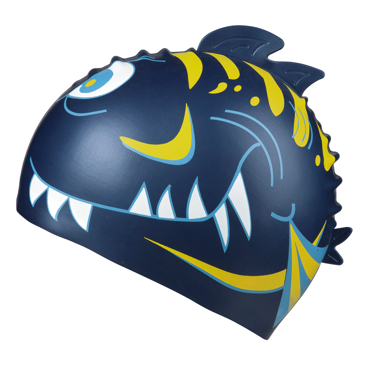 Bonnet de bain enfants jaune en silicon avec sujet requin, grandeur unique.