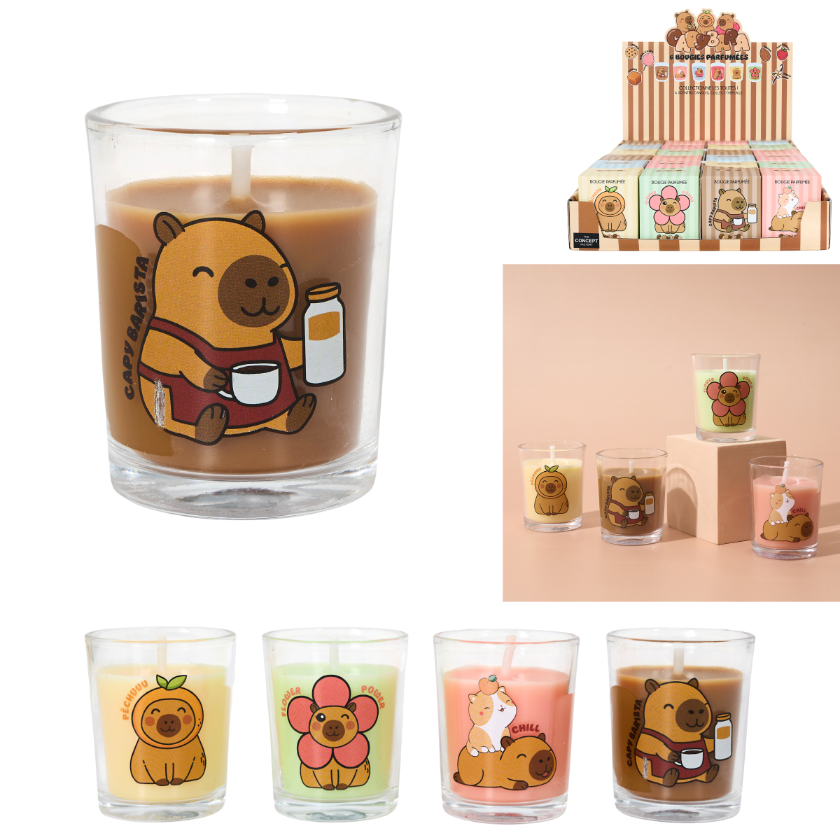 Bougie parfumée capybara en pot de verre, 4-fois assortis, présenté dans une boîte. Idéal comme cadeau.