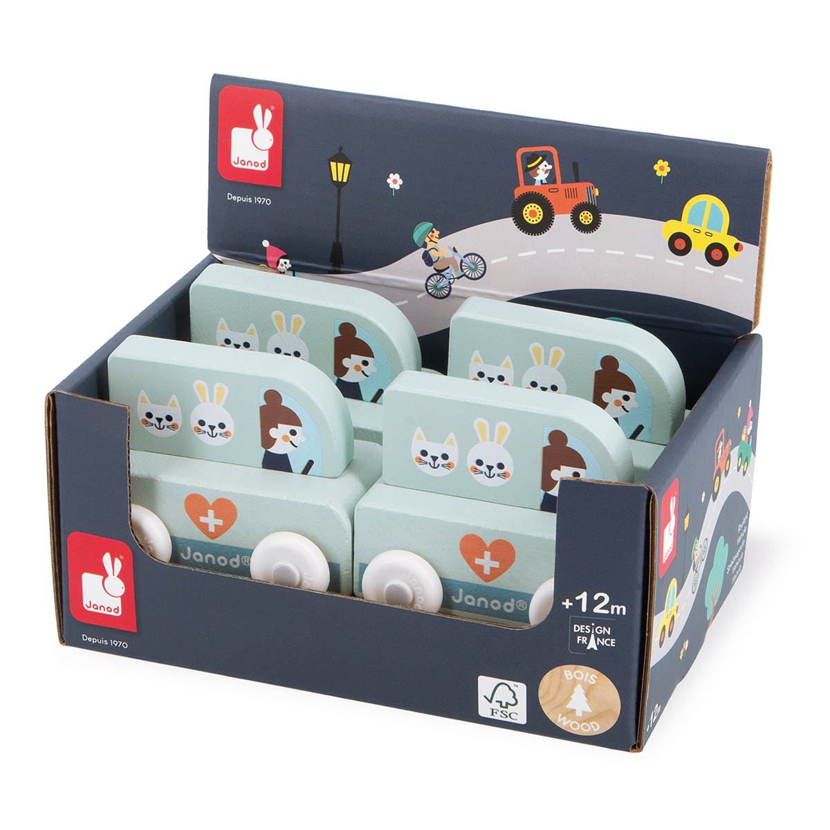 Vite une urgence à la ferme, le vétérinaire doit se dépêcher pour sauver les animaux ! Avec un camion vétérinaire il est possible d'imaginer de nombreuses aventures palpitantes. Grâce à sa forme, le roulant est facile à prendre en main. Jouet en bois FSCTM, pour les enfants à partir de 12 mois Associé à ton tapis et au joli coffret de cube de la gamme Janod, ce roulant complète parfaitement ton univers.