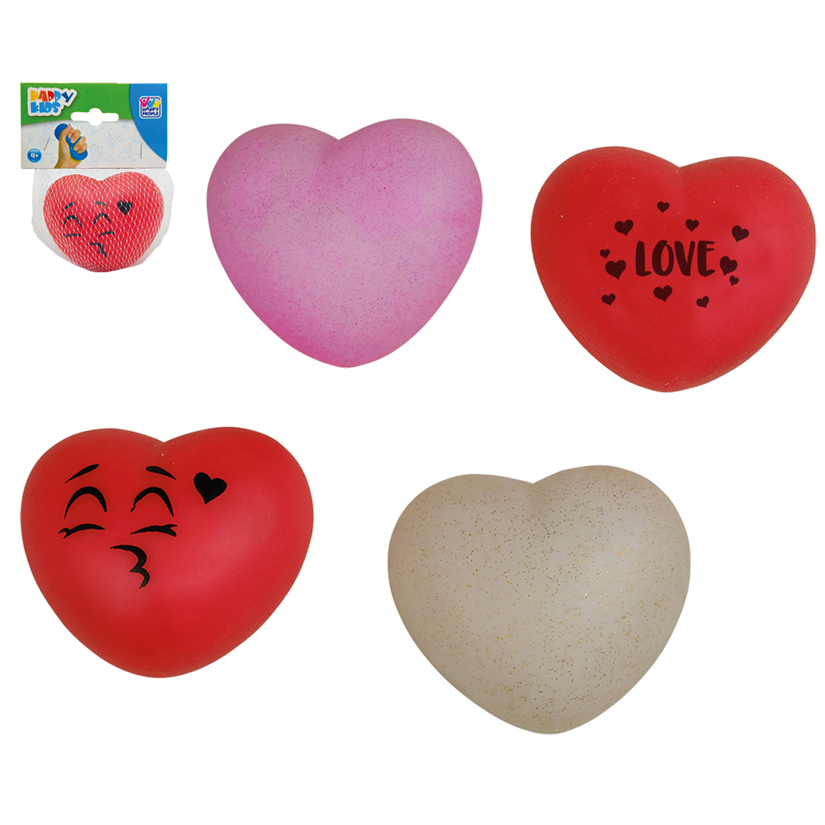 Coeur anti-stress 9cm 4-fois assortis:1x rouge Love, 1x rouge avec visager, 1x coeur rose-brillant, 1x coeur rose-brillant Love.