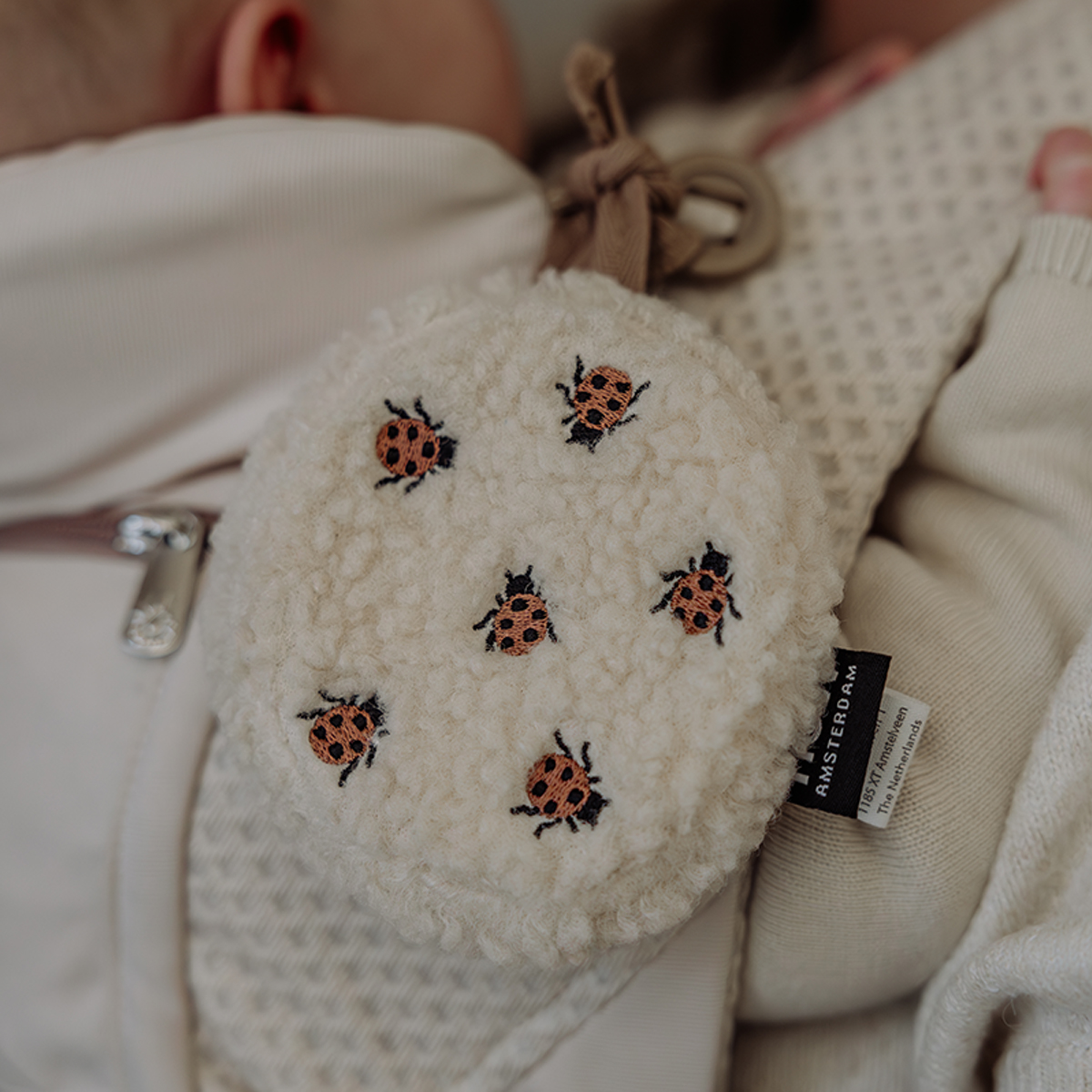 Le Comforter on the go est une version plus petite que vous pouvez emporter avec vous. Cette Comforter avec un battement de cœur donne à votre enfant un sentiment de sécurité et de réconfort en déplacement. Vous pouvez facilement attacher le comforter avec un ruban au Maxi Cosi ou à la poussette. Le comforter est livré avec une boîte à musique qui joue 2 sons: battement de cœur et bruit blanc. Avec un gros bouton, vous pouvez allumer la boîte à musique, ajuster le volume et alterner entre les deux sons. Comme le bouton est extra large, la boîte à musique est également facile à utiliser.