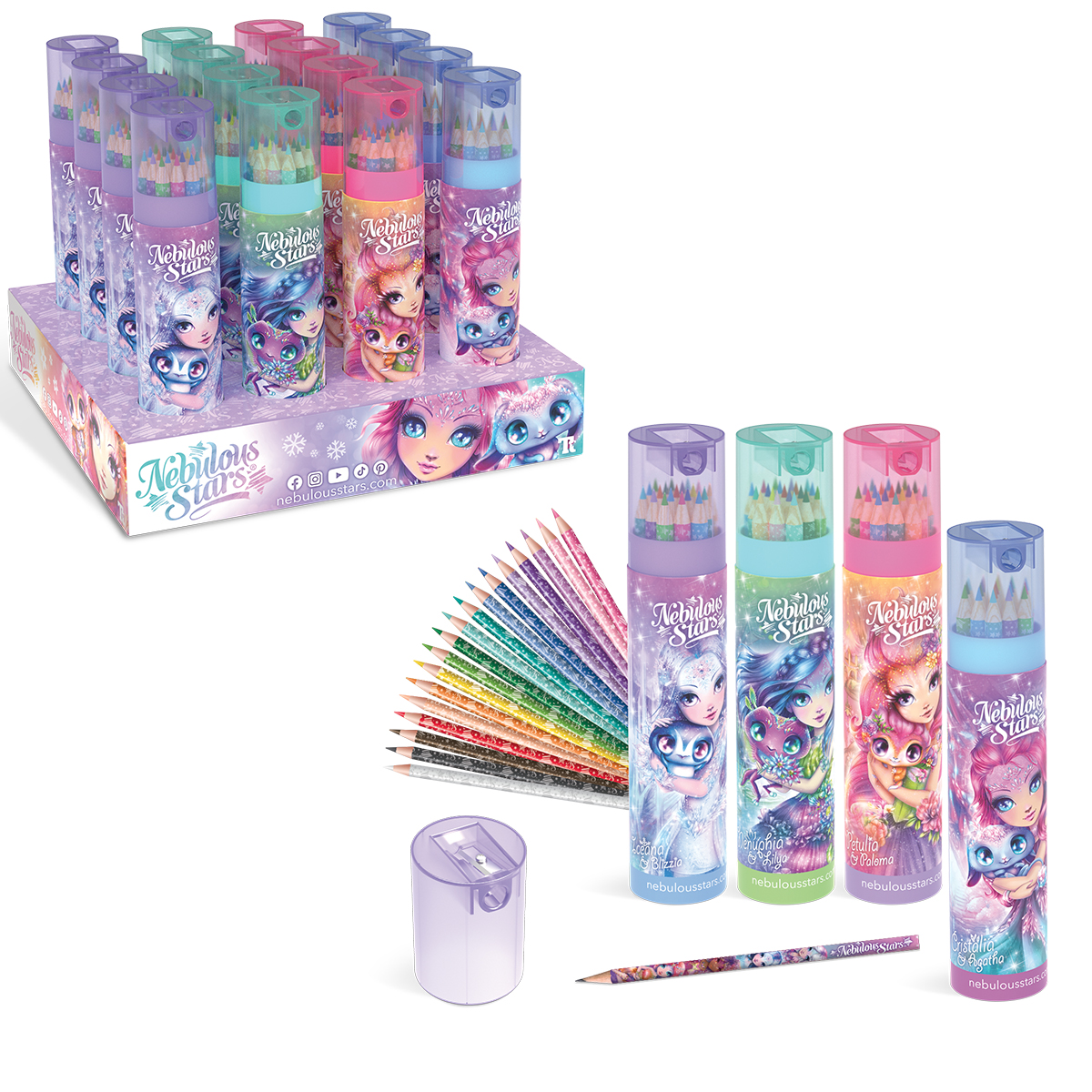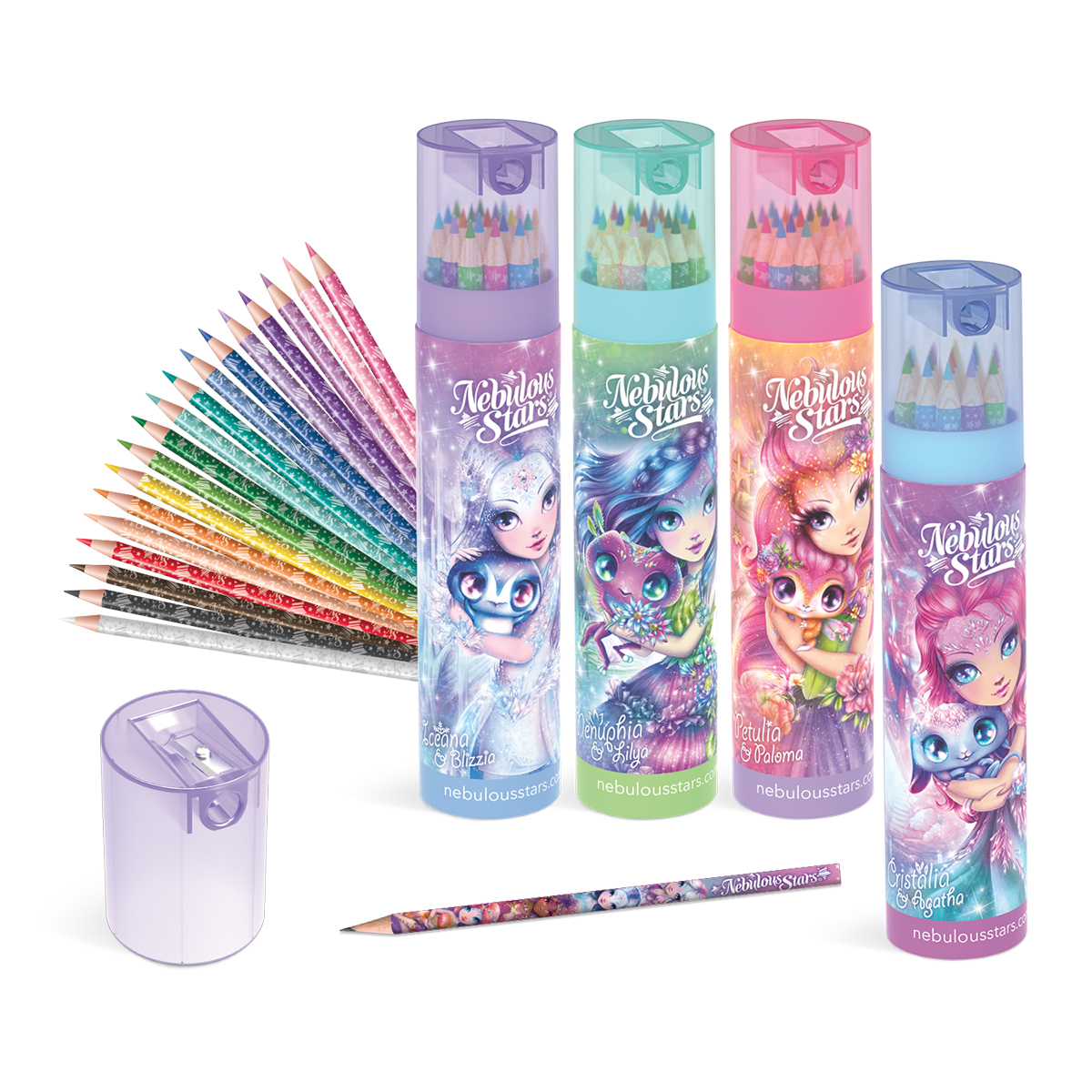 Chaque tube contient un taille-crayon intégré, 18 crayons de couleur et un crayon à papier. Emportez-les partout, dessinez et croquez ! Chaque tube est doté d'un taille-crayon intégré. Contient 18 crayons de couleur et un crayon à papier Étoile Nébuleuse.