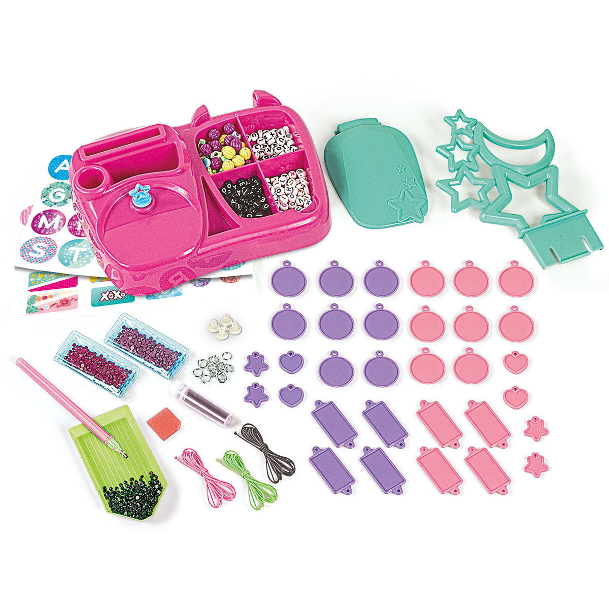 Crazy Chic Message Creations Set. Un kit pour créer des bijoux et des accessoires tendance avec des lettres, des perles colorées, des strass scintillants et des cordons élastiques. La base est composée de trois parties: une zone pour décorer les breloques et les plaques avec les strass colorés, un compartiment pour répartir les perles et un porte-bijoux pour ranger les créations. Des bracelets et des colliers aux couleurs vives sur lesquels les filles peuvent inscrire leur nom ou leurs tags préférés pour exprimer pleinement leur sens créatif et leur style unique.