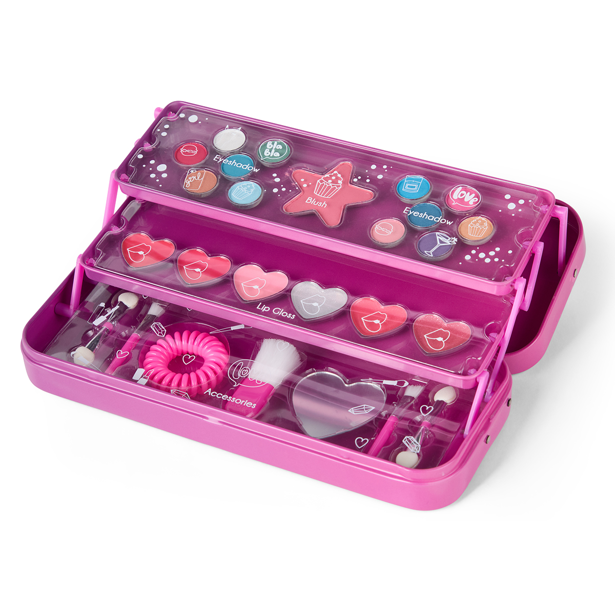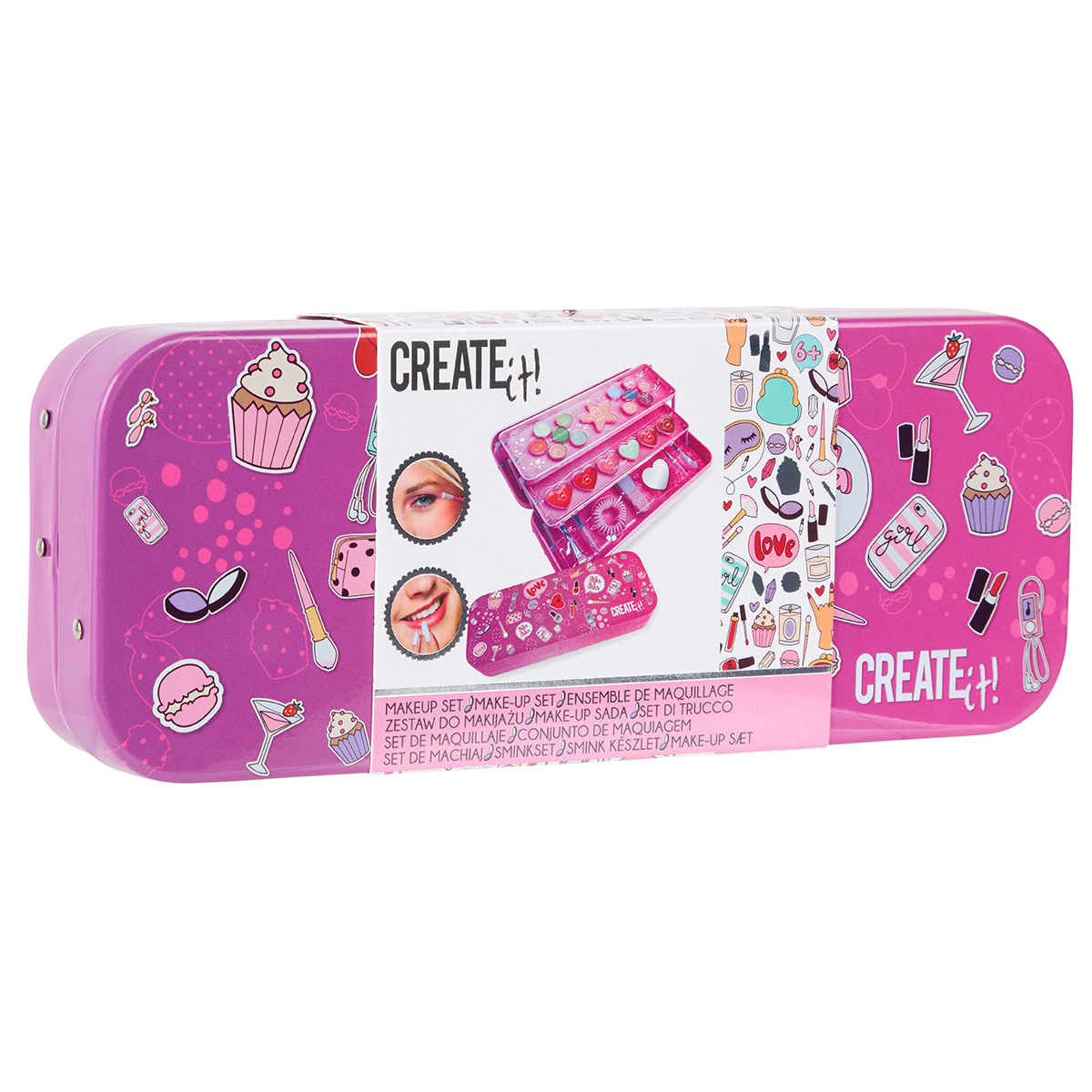 Create it! Set de maquillage en boîte métallique avec ombre à paupières, blush, gloss, pinceau éponge pour les yeux, pinceau pour le blush, pinceau pour l'ombre à paupières, élastique pour les cheveux, pinceau pour le gloss.