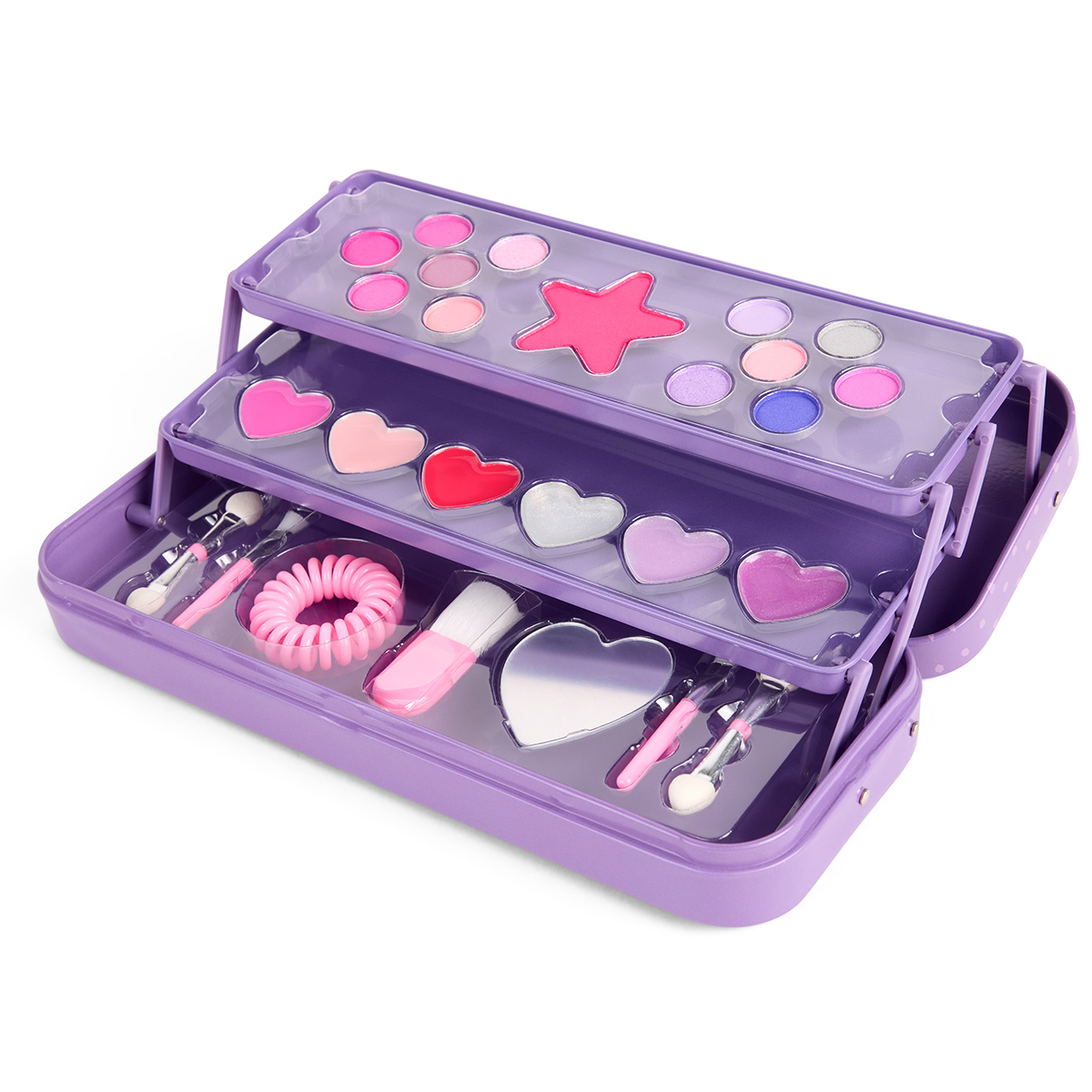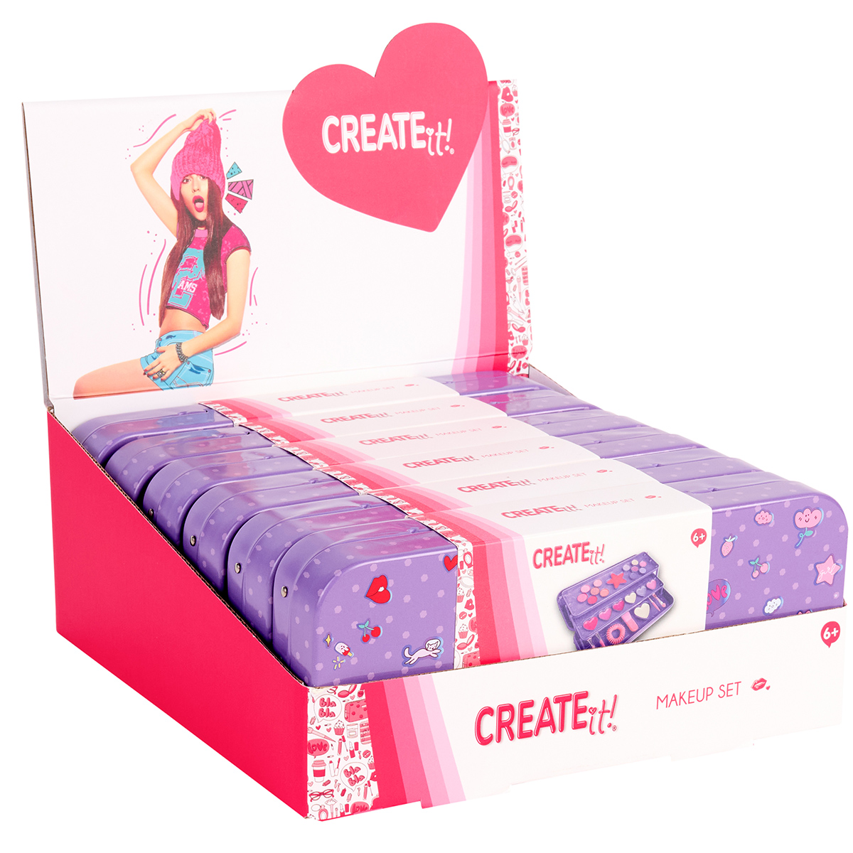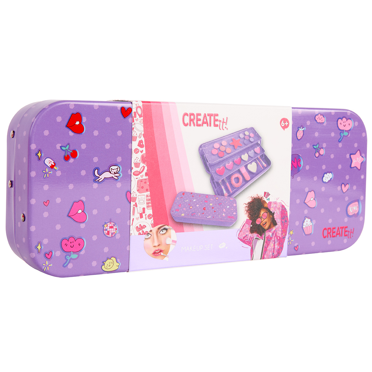 Create it! Set de maquillage en boîte métallique avec ombre à paupières, blush, gloss, pinceau éponge pour les yeux, pinceau pour le blush, pinceau pour l'ombre à paupières, élastique pour les cheveux, pinceau pour le gloss.