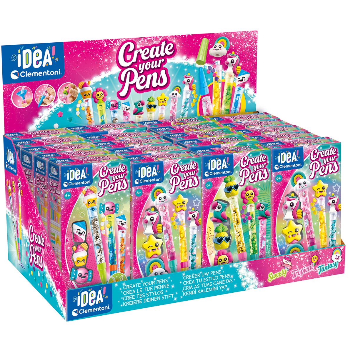Display Crée tes Stylos assortis 24 pcs. Des coffrets créatifs originaux qui permettent d’assembler 3 stylos et de les personnaliser avec différentes décorations, en choisissant entre 3 thématiques différentes. Le coffret contient 3 stylos à ssembler, 3 encres de couleurs différentes, 3 personnages et tous les accessoires pour les décorer. Ce jeu permet de créer et de personnaliser ses stylos avec plein d’accessoires et de décorations variées.