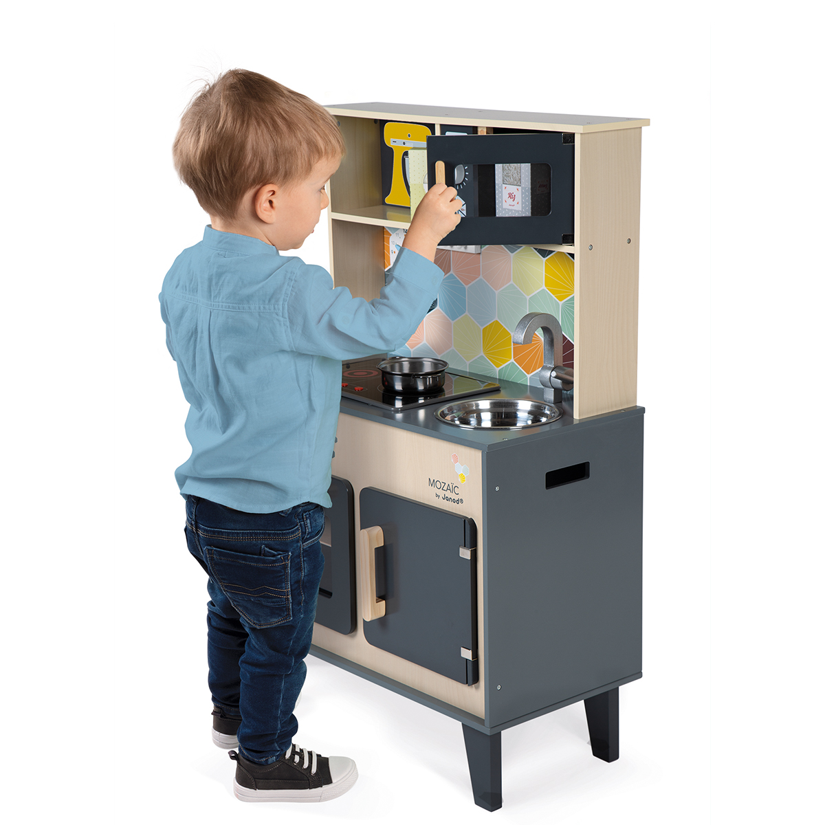 Comme papa et maman, prépare de bons petits plats pour tes amis et deviens un vrai Petit Chef !!! Grande cuisine Mozaïc toute en bois avec une patère pour suspendre 1 écumoire, 1 casserole et 1 passoire en métal, et 3 boites d'aliments en carton (fromage, farine, riz). Comme une véritable cuisine, elle est équipée d’une plaque à induction sonore à led : il suffit d'appuyer une fois sur les boutons rouges pour que les plaques s'allument, puis une deuxième fois pour entendre le son de l'eau qui bout. Le son et les plaques à induction s'éteignent automatiquement au bout de 30 secondes ou si vous appuyez une troisième fois sur les boutons rouges. Cette magnifique cuisine toute équipée comprend également un four, un micro-ondes, un placard, 3 boutons rotatifs avec bruitage, un évier en inox et une horloge. 6 accessoires. Hauteur du plan de travail : 50 cm. 2 piles alcalines LR6 - 1,5V sont nécessaires. Piles non incluses. Dim : 55 x 30 x 87 cm. Pour enfants de 3 à 8 ans.