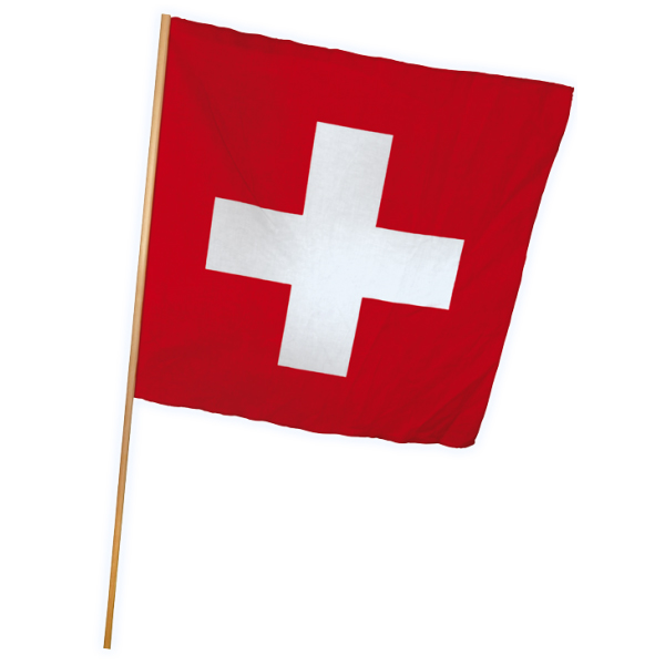 Drapeau rouge, avec croix suisse. Drapeau en tissu, 30x30cm, avec un bâton en bois. Peut être utilisé comme décoration pour votre fête de 1er août.