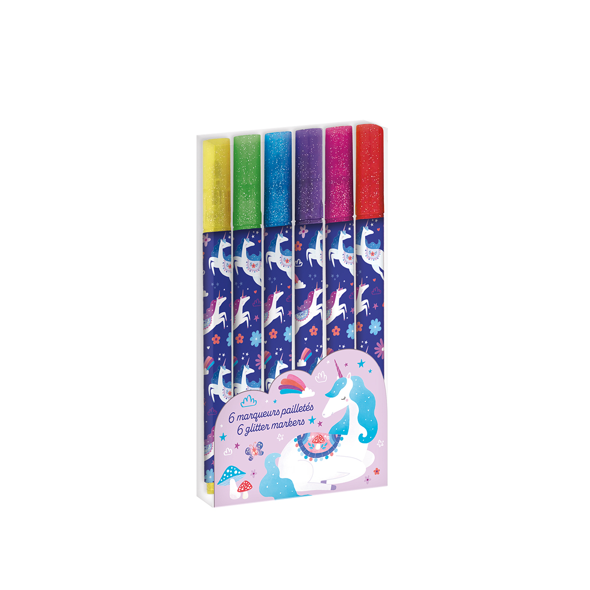 Mets des paillettes dans tes cahiers ! Cette pochette de 6 marqueurs pailletés est parfaite pour l'écriture et le coloriage. Elle contient 6 marqueurs : jaune, rouge, vert, rose, bleu, violet. La collection dreamland revisite la thématique des licornes dans un univers coloré original. Ces marqueurs sont recommandés pour les enfants à partir de 6 ans.