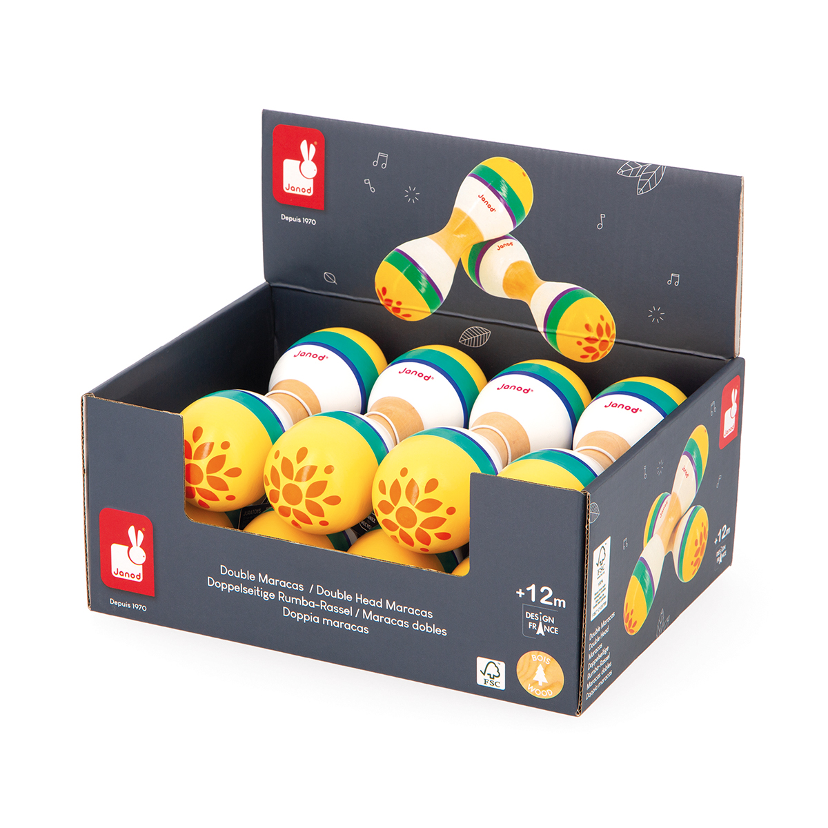 Tchiik, tchiik!! Les petits pourront jouer le rythme en secouant joyeusement cette double maracas, parfaitement adaptée à leurs petites mains! Les jouets musicaux éveillent tous les sens et permettent aux plus jeunes musiciens de s'initier aux joies de l'improvisation musicale. Les billes sont encapsulées dans une coque en plastique pour éviter tout risque d'ingestion. Jouet d'éveil musical en bois FSCTM. Pour les enfants à partir de 12 mois.