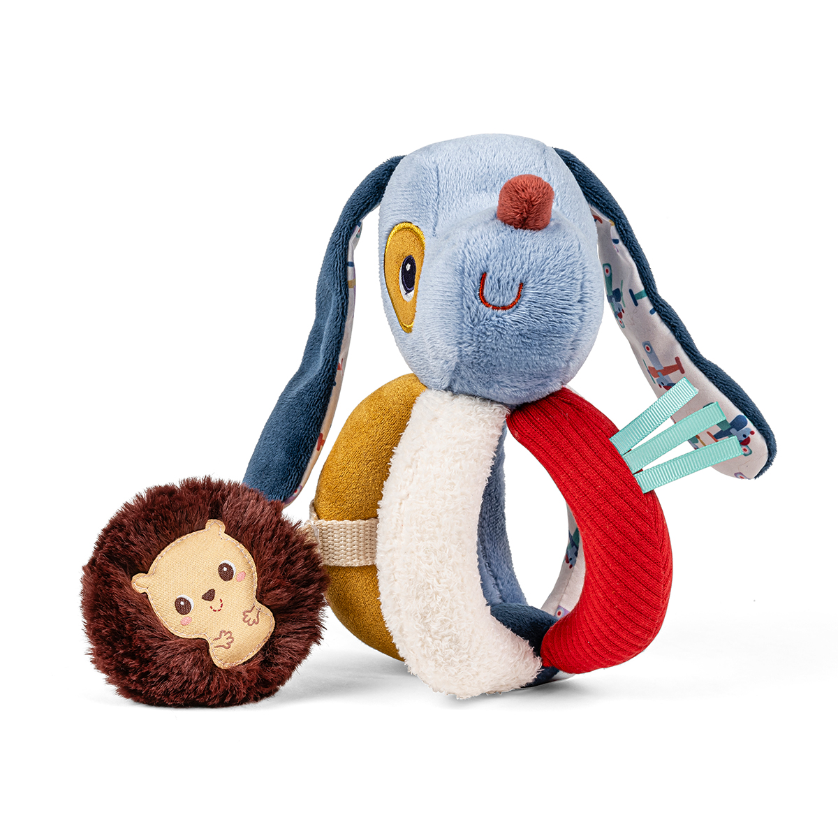 Hochet à poignées Jules le chien. Jules ne sort jamais jouer sans Léon le hérisson ! Avec ce gros hochet à poignées, bébé s'éveille en douceur dès l'âge de 6 mois. Pour cela, il dispose de 4 activités sensorielles pour se divertir en bonne compagnie. D'abord, un hochet à faire tinter encore et encore dans la tête de Jules le chien, idéal pour éveiller votre tout-petit aux sons. Ensuite, les cinq poignées qui composent le jouet proposent différentes matières et motifs qui stimuleront la vue et le toucher. Duveteux, rainuré … Il y a même du papier bruissant à faire crépiter, et des rubans colorés ! Enfin, un second hochet se cache dans le petit hérisson. Pour le saisir, il faudra plonger sa main dans le corps de Jules et se frayer un chemin entre les poignées ! Vous l'aurez compris, ce jouet d'activités permet à bébé de développer son acuité visuelle et auditive, mais aussi sa motricité. Dans son format 12 x 11 x 19 cm, il se présente telle une balle d'activités en peluche toute douce. Très agréable à parcourir et à câliner, on peut faire rouler ce jouet d'éveil Lilliputiens et plonger ses mains à l'intérieur pour l'explorer davantage. La taille et la forme des poignées ont été pensées pour s'adapter aux petites mains de bébé. Composé de polyester, ce hochet à poignées Jules le chien est lavable en machine à 30°. C'est un cadeau de naissance idéal pour offrir ses premiers copains tout doux à bébé, et éveiller sa curiosité.